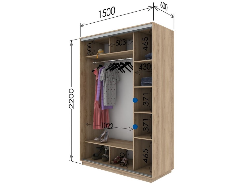 Šatní skříň s posuvnými dveřmi v moderním provedení. Nezvyklá výška 220 cm Vám nabídne větší úložný prostor. Korpus je z kvalitní LTD desky v barvě dub sonoma. Skříň má aluminiové kování a lišty, dveře jsou osazeny zrcadly. Uspořádání polic viz. obrázek. Dodáváme v demontovaném stavu. Možnost dokoupení praktického bočního regálu nebo zásuvek do vnitřního prostoru skříně (modrá barva na perokresbě naznačuje, kam lze zásuvky umístit), obojí naleznete v naší nabídce.Doplňkové parametry