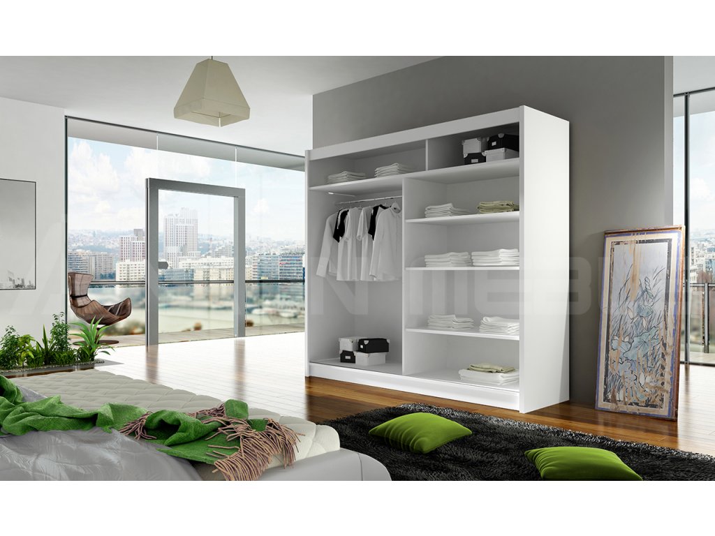 Skříň je vyrobena z kvalitního lamina. Díky svému vnitřnímu uspořádání nabízí dostatek úložného prostoru, posuvné dveře šetří prostor a zrcadlo ho opticky zvětšuje. Skříň je vhodná do ložnice, dětského nebo studentského pokoje, do předsíně i kanceláře. Vnitřní uspořádání skříně je vyobrazeno na fotografii. Skříň je dodávána v demontu. Součástí je i skleněné zrcadlo, které je nalepeno na jedné části dveří skříně a také montážní plánek včetně všech potřebných spojovacích materiálů. Vyobrazené dekorace nejsou v ceně.
