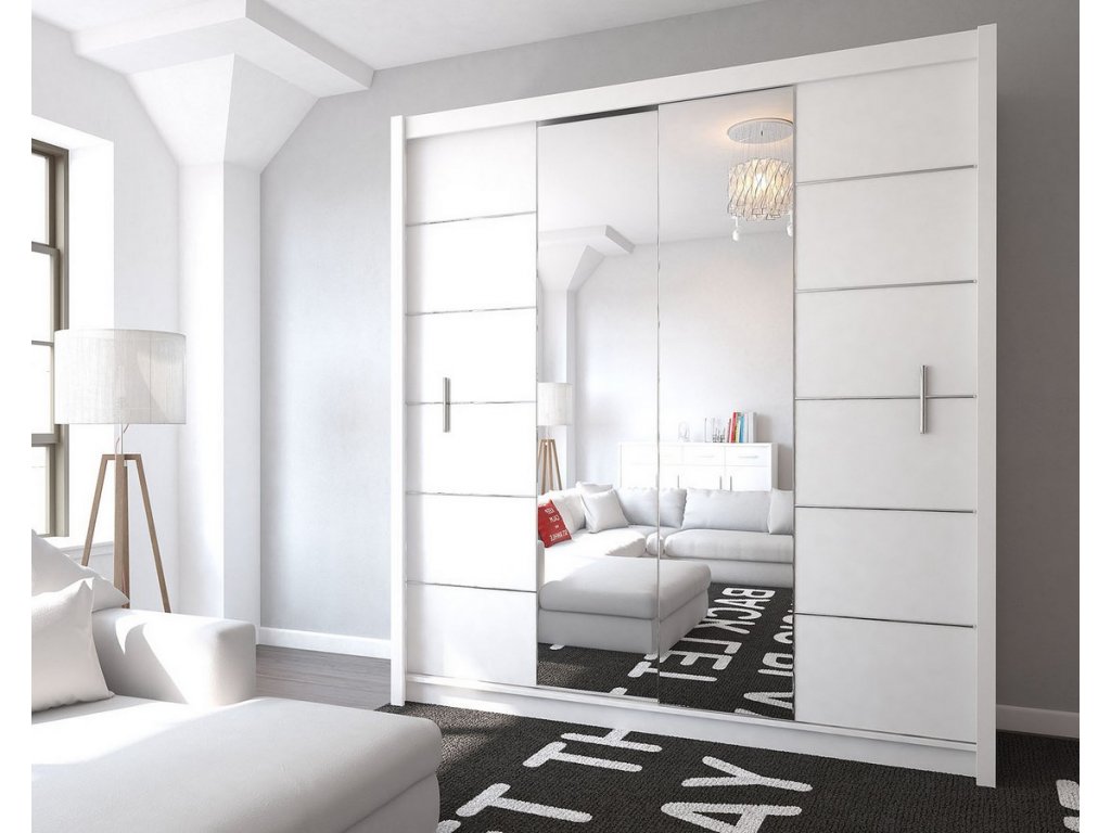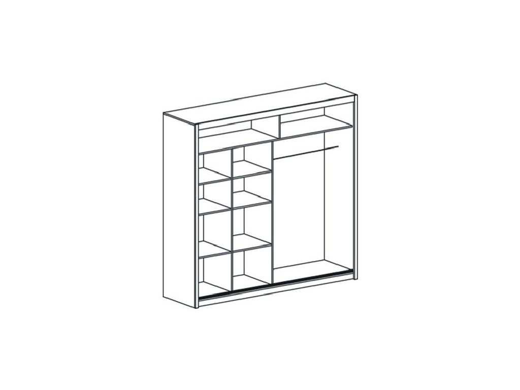 Šatní skříň s posuvnými dveřmi v moderním provedení. Korpus i dvířka jsou z kvalitního LTD v barvě bílá. Dveře obsahují praktické zrcadlo. Uspořádání polic viz. perokresba. Dodáváme v demontovaném stavu.Doplňkové parametry