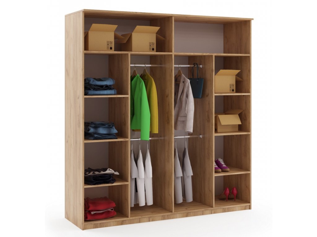 Šatní skříň s posuvnými dveřmi v moderním provedení. Korpus i dvířka jsou z kvalitní LTD desky v kombinaci barev dub kraft zlatý/černá doplněné zrcadlem. Uspořádání polic viz. obrázek. Dodáváme v demontovaném stavu.Doplňkové parametry