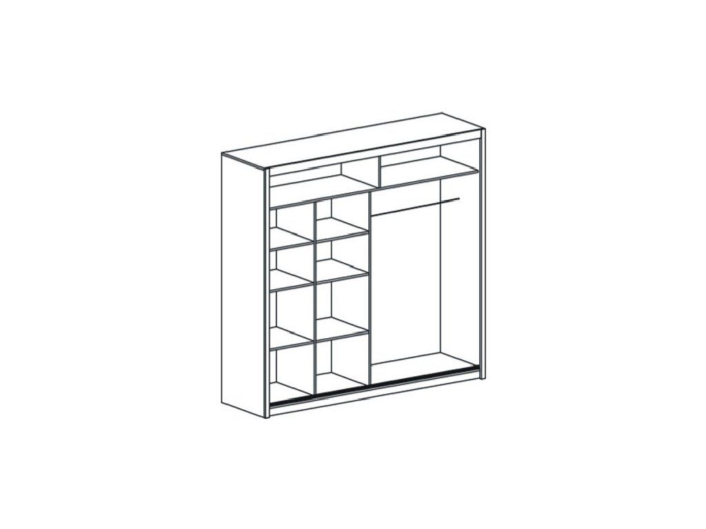 Šatní skříň s posuvnými dveřmi v moderním provedení. Korpus i dvířka jsou z kvalitního LTD a barevné provedení je bílý mat. Skříň obsahuje praktické zrcadlo. Uspořádání polic viz. perokresba. Dodáváme v demontovaném stavu.Doplňkové parametry