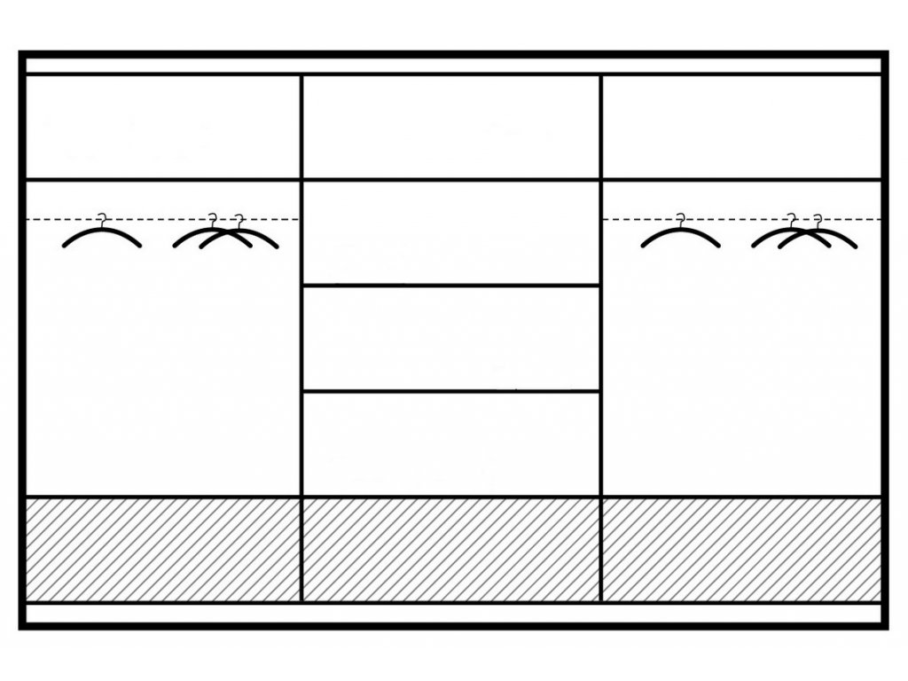 šířka: 250 cm | výška: 215 cm | hloubka: 61 cm Šatní skříň s třemi posuvnými dveřmi v moderním provedení. Krajní části jsou policové, uprostřed je šatní tyč a 2 zásuvky. Korpus...