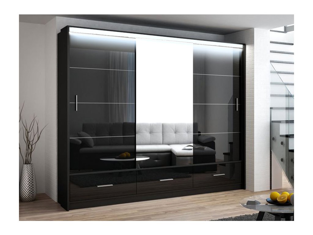 Šatní skříň s posuvnými dveřmi v moderním provedení. Korpus i dvířka jsou z kvalitního LTD v barvě černé. Prostřední dveře mají zrcadlo, boční černý lesk. Skříň má dvě šatní tyče a uprostřed jsou police, v dolní části skříně jsou tři velké zásuvky Uspořádání polic viz. perokresba. Kvalitní kování Sevroll. Elegantní LED osvětlení skříně je v ceně. Dodáváme v demontovaném stavu.Doplňkové parametry