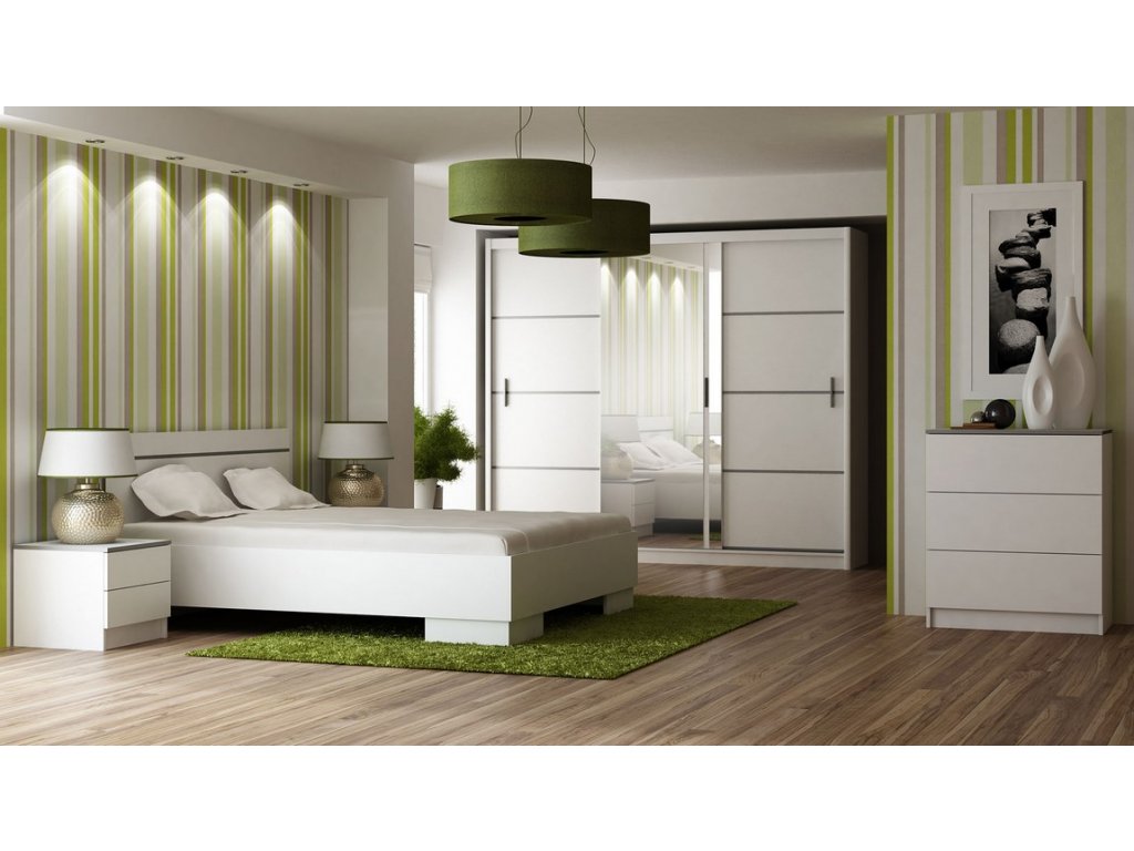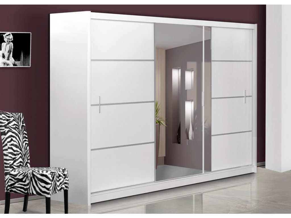 Šatní skříň s posuvnými dveřmi v moderním provedení. Korpus i dvířka jsou z kvalitního LTD a barevné provedení je bílý mat. Skříň obsahuje praktické zrcadlo. Uspořádání polic viz. perokresba. Dodáváme v demontovaném stavu.Doplňkové parametry