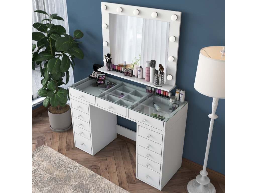 Toaletní stolek nejenže skvěle vypadá, ale také nabízí dostatek úložného prostoru díky 13 zásuvkám. Zrcadlo integrované do designu usnadňuje přípravy a dodává stolku další praktičnost.