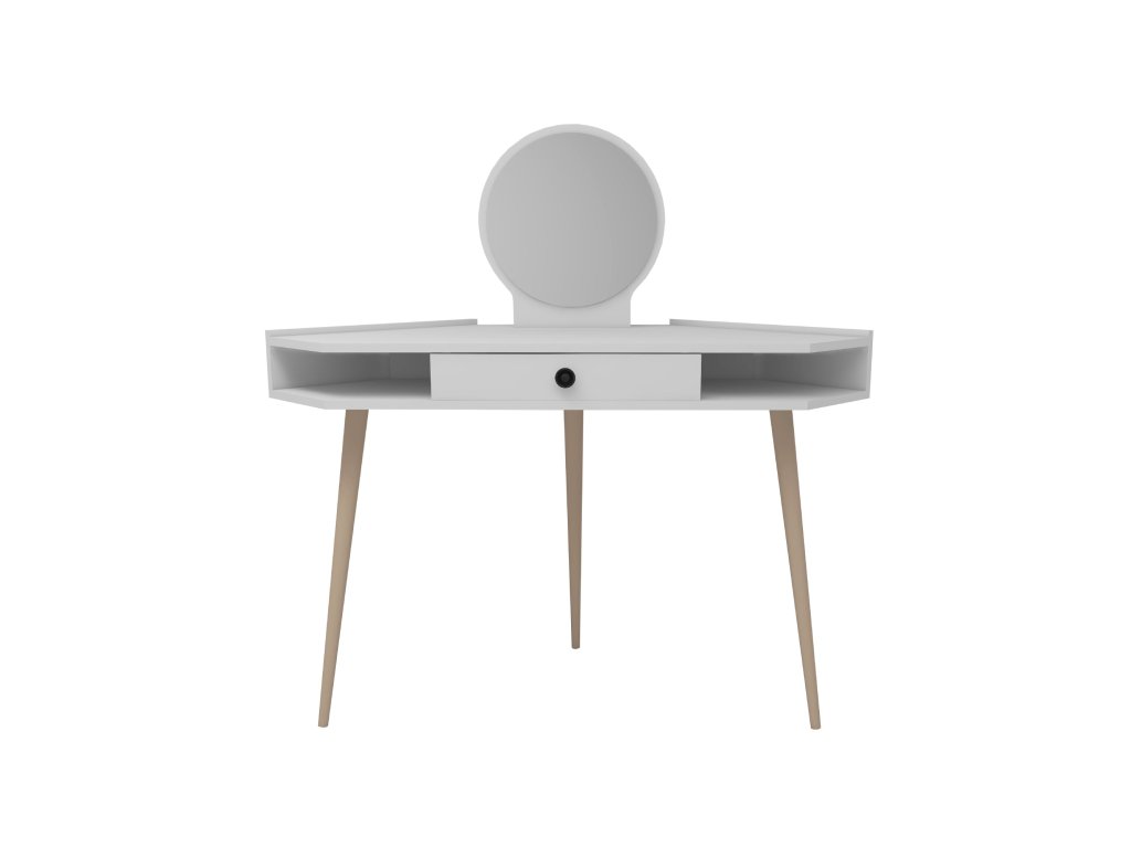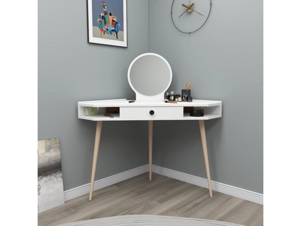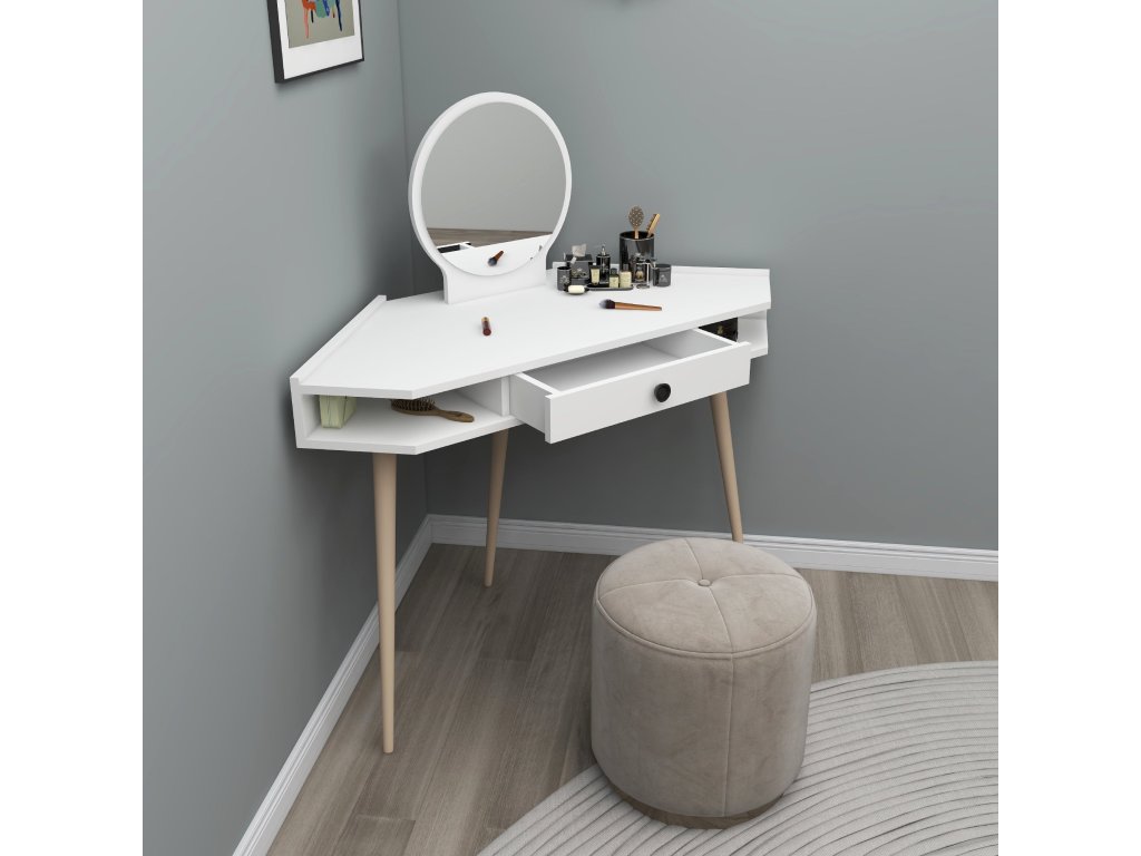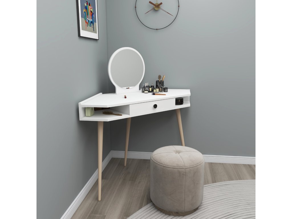 Toaletní stolek je ideálním řešením pro ložnice, které potřebují elegantní a funkční doplněk. Díky svému rohovému designu efektivně využívá prostor a nabízí praktické vybavení, včetně zásuvky, regálku a integrovaného zrcadla. Dřevěné nohy přidávají na stabilitě a estetickém dojmu, zatímco kvalitní materiály zajišťují dlouhou životnost.