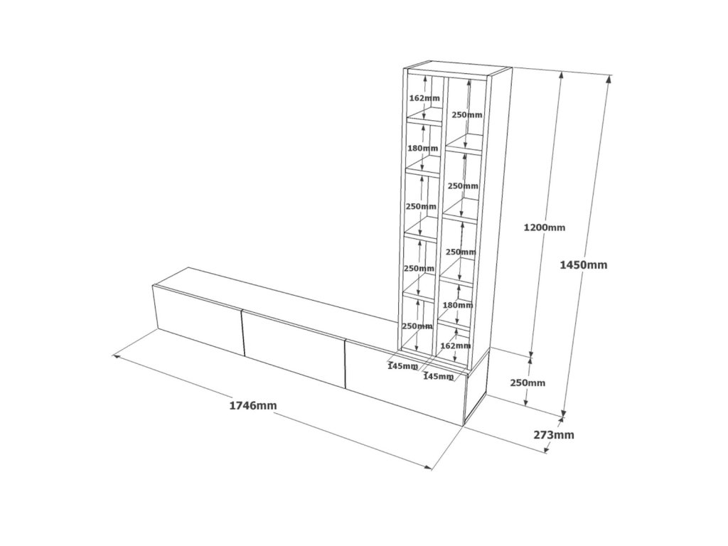 - Vybavení: 3 dveřová dvířka (skříňka) a regálek
