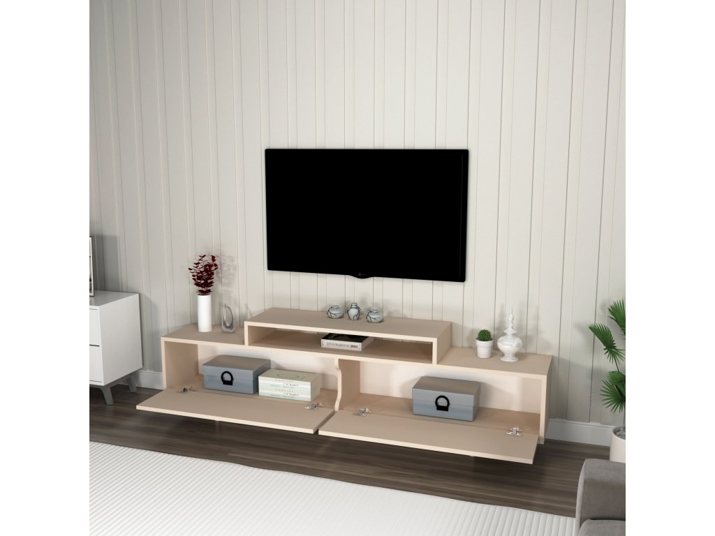 TV stolek je ideální volbou pro každého, kdo hledá stylový a funkční doplněk do obývacího pokoje. Díky kombinaci plných dvířek a regálků poskytuje dostatek prostoru pro uložení elektroniky, příslušenství nebo dekorací. Jeho čistý a elegantní design snadno zapadne do moderního interiéru.