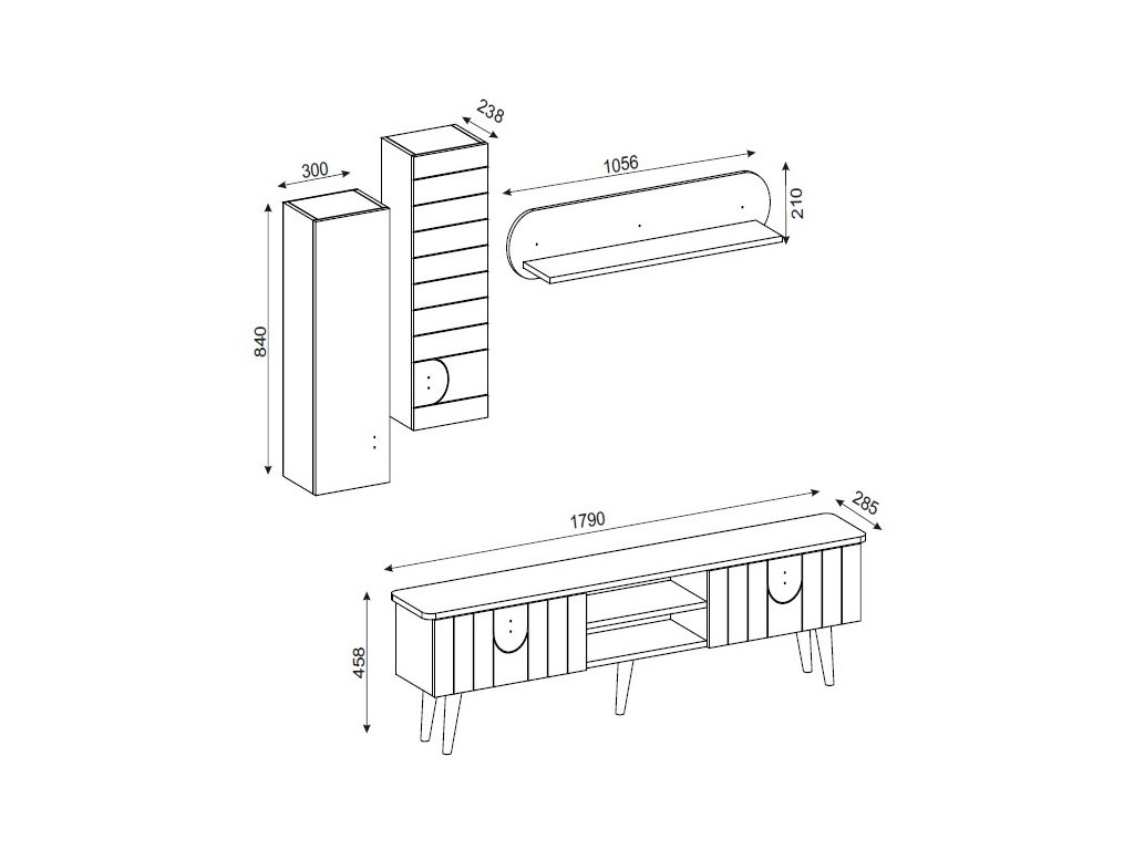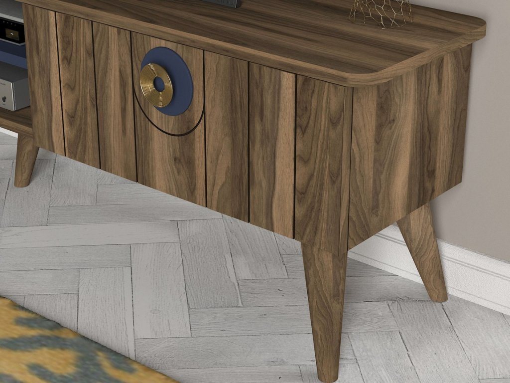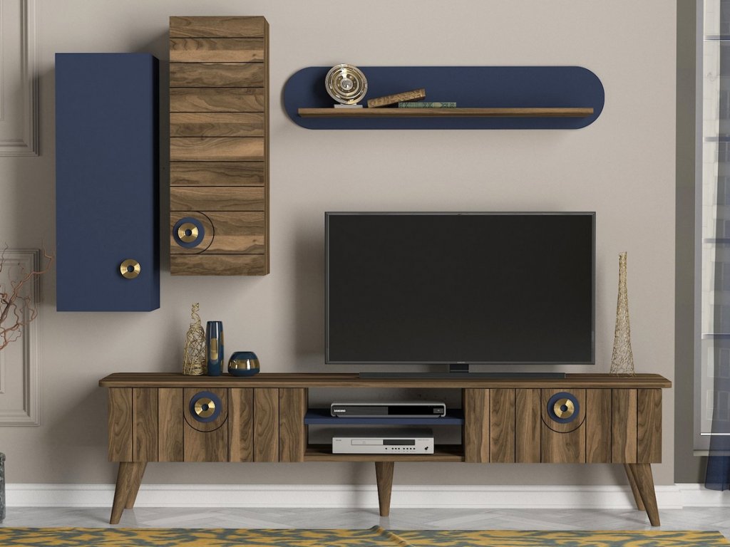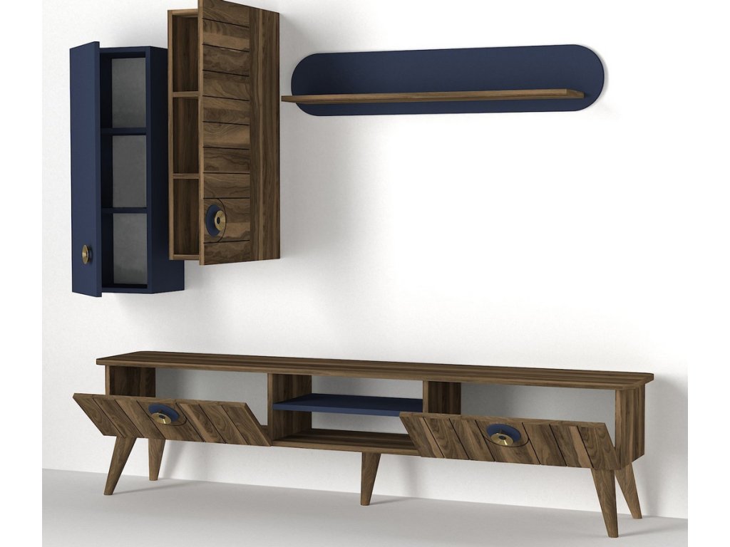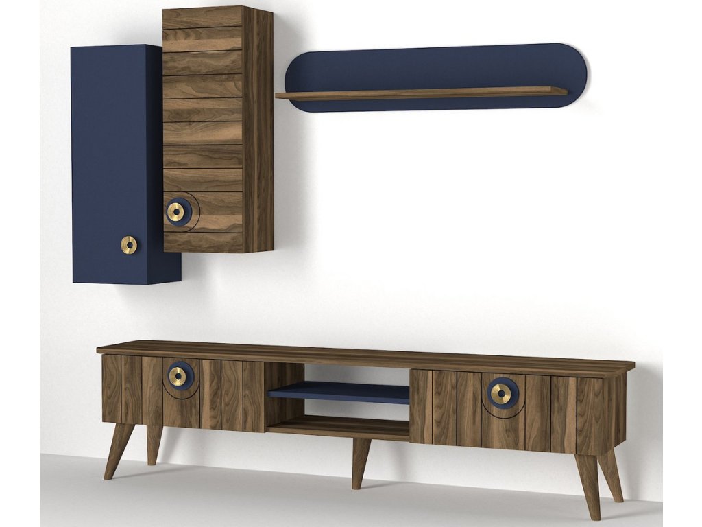Televizní sestava je vyrobena z kvalitního lamina o tl.18 mm hraněné PVC páskou, odolného proti poškrábání v kombinaci barev vlašský ořech/modrá loft. Sestava se skládá z těchto položek(Š x V x H cm) - televizní stolek (179 x 45,8 x 29 cm), závěsná skříňka 2 ks (30 x 84 x 23,8 cm) a závěsná police (105 x 21 x 16 cm). Dodáváme v demontovaném stavu.Doplňkové parametry