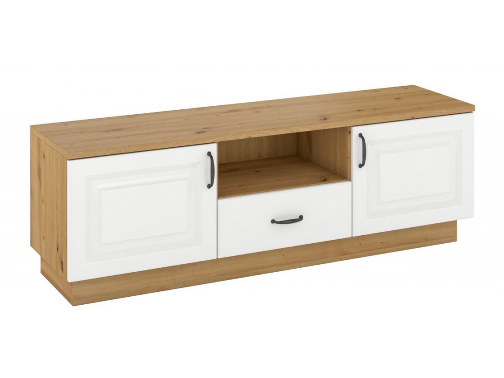 Televizní stolek dvoudveřový se zásuvkou v moderním provedení venkovského stylu. Korpus je vyroben z kvalitního lamina v barvě dub artisan, dvířka jsou vyrobena z desky MDF v barvě bílé. Úchyty jsou kovové černé. Dodáváme v demontovaném stavu.Doplňkové parametry