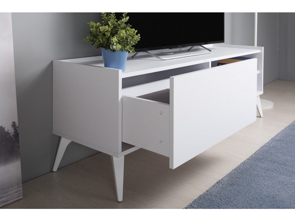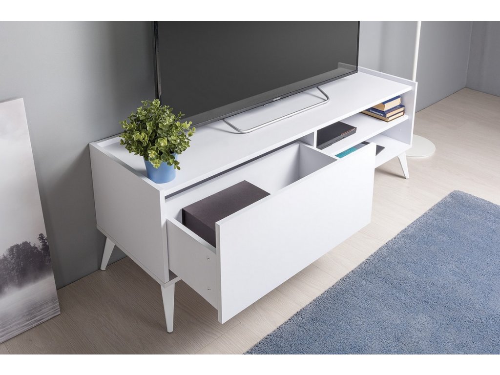 Televizní stolek se zásuvkou je vyroben z desky LTD tl. 16 mm hraněné ABS páskou v barvě matná bílá. Zásuvka je vybavena systémem tichého dovírání. V pravé části stolku je police. V zadní části je otvor pro protažení kabelů. Nožky jsou kovové v bílé barvě. Dodáváme v demontovaném stavu. DOPRODEJ!Doplňkové parametry