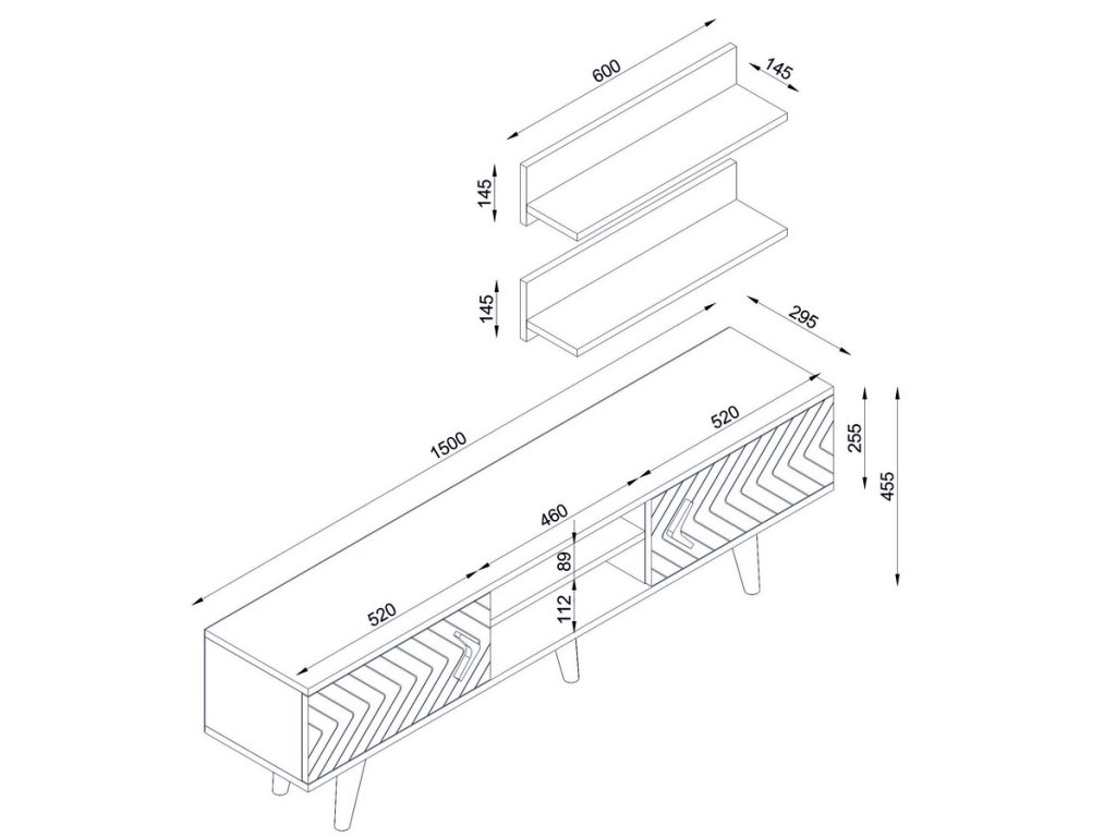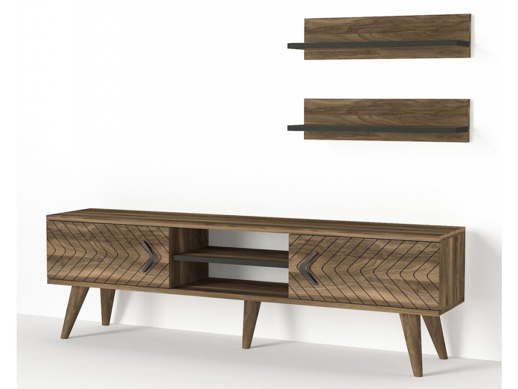 Televizní stolek s dvěma ozdobnými dvířky je vyroben z kvalitního lamina o tl.18 mm hraněné PVC páskou, odolného proti poškrábání v barvě vlašský ořech. Součástí balení jsou také dvě závěsné police o rozměrech (Š x V x H cm) 60 x 15 x 15 cm. Dodáváme v demontovaném stavu.Doplňkové parametry