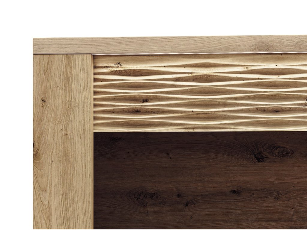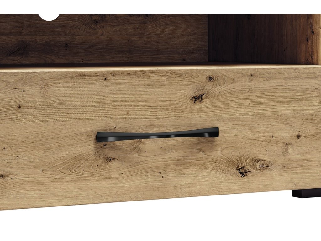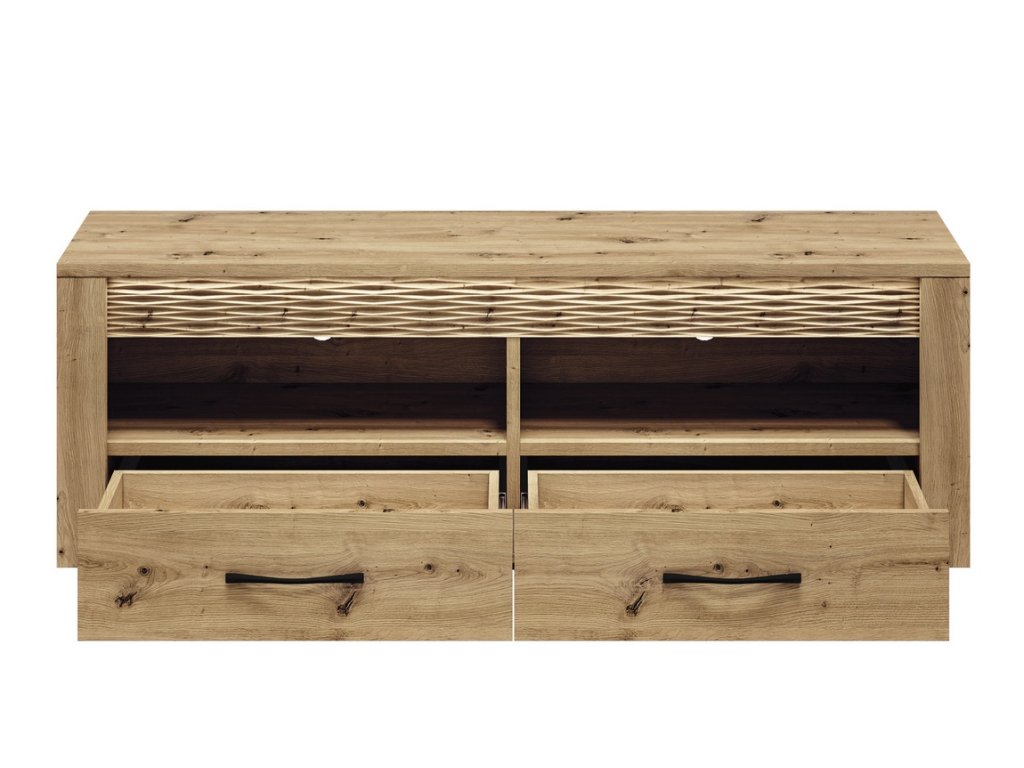 Televizní stolek je vyroben z kvalitní desky LTD hraněné ABS páskou v barvě dub artisan. Dekorační riflovaná lišta nahoře z MDF obsahuje LED osvětlení v ceně. Dvířka jsou vybaveny systémem tichého dovírání. Úchyty jsou kovové černé. Dodáváme v demontovaném stavu.Doplňkové parametry