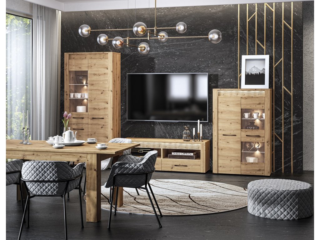 Sestava do obývacího pokoje je vyrobena z kvalitní desky LTD hraněné ABS páskou v barvě dub artisan. Sestava se skládá z těchto položek (Š x V x H cm) - vitrína třídveřová (92 x...
