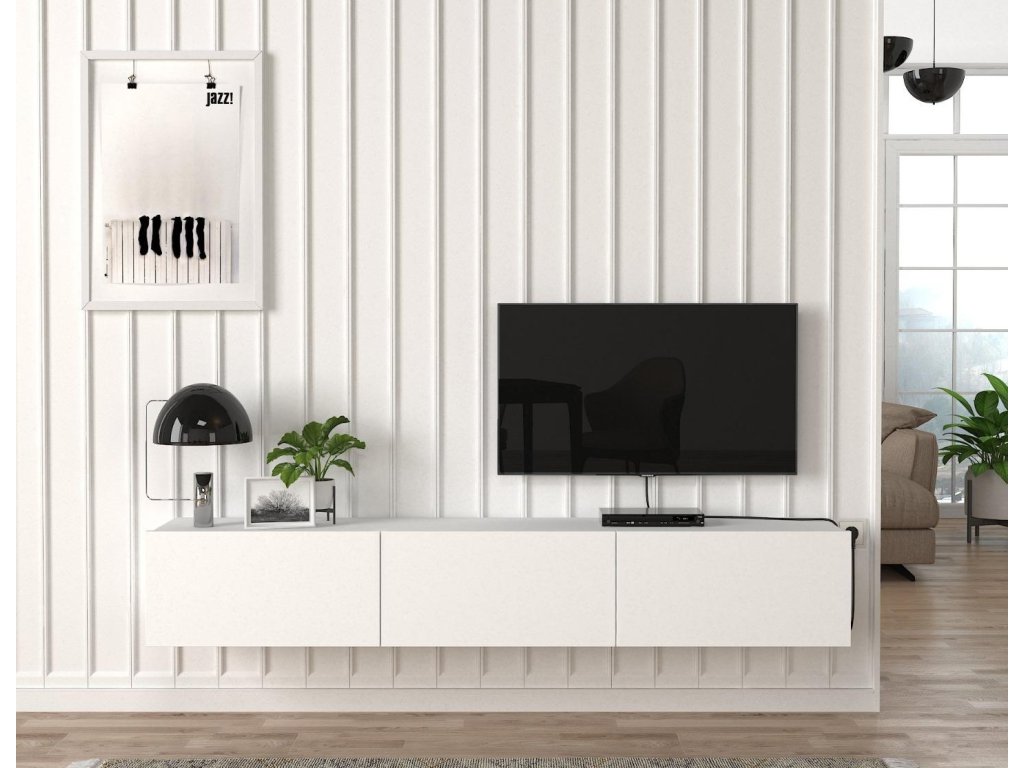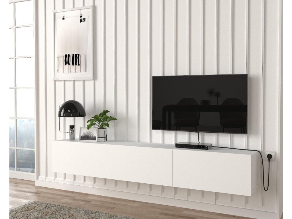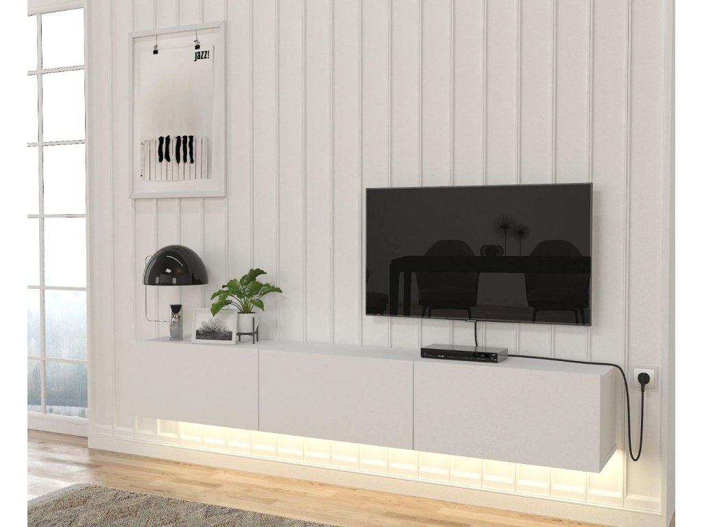 Závěsný televizní stolek se třemi výklopnými dvířky je vyroben z kvalitního lamina o tl.18 mm hraněné PVC páskou, odolného proti poškrábání v barvě matná bílá. Stolek dodáváme s LED osvětlením v ceně. Dodáváme v demontovaném stavu.Doplňkové parametry