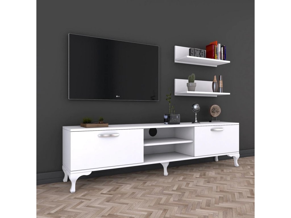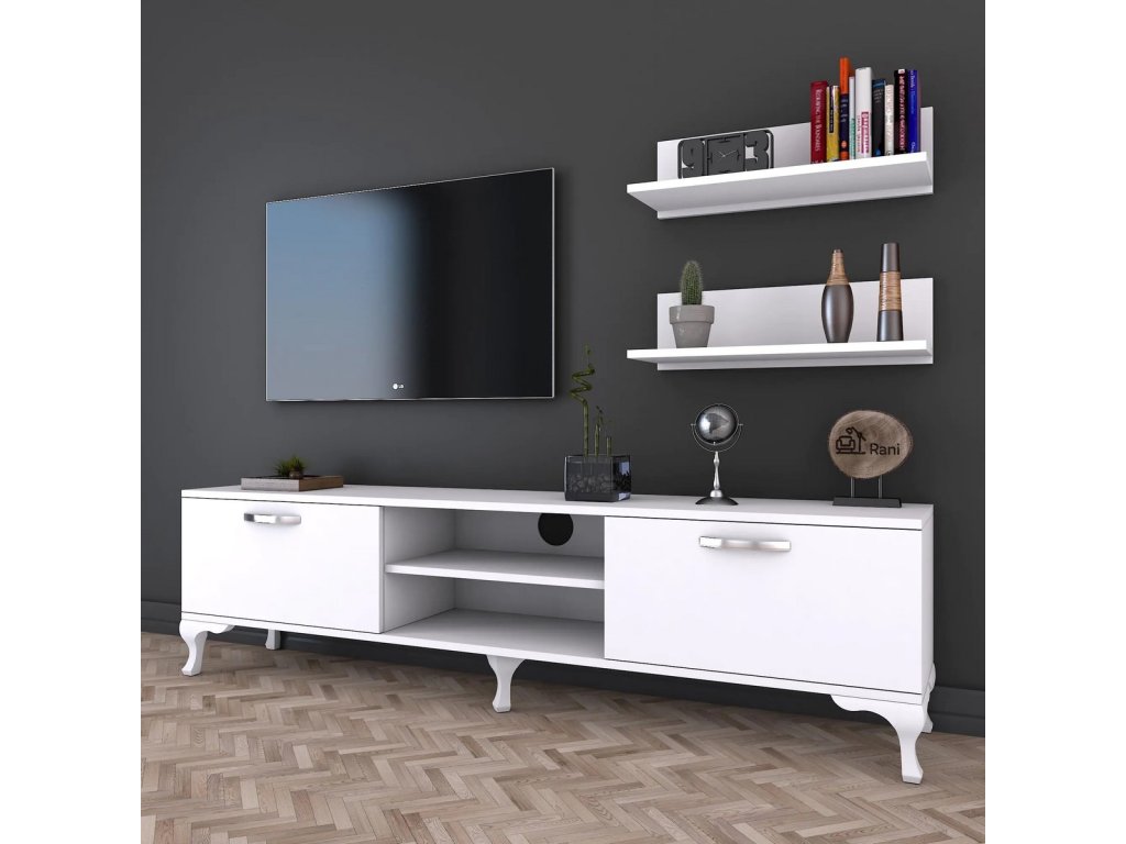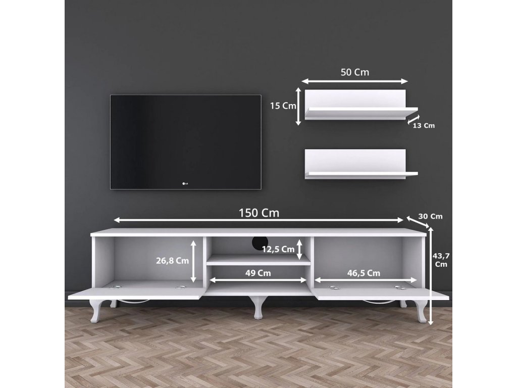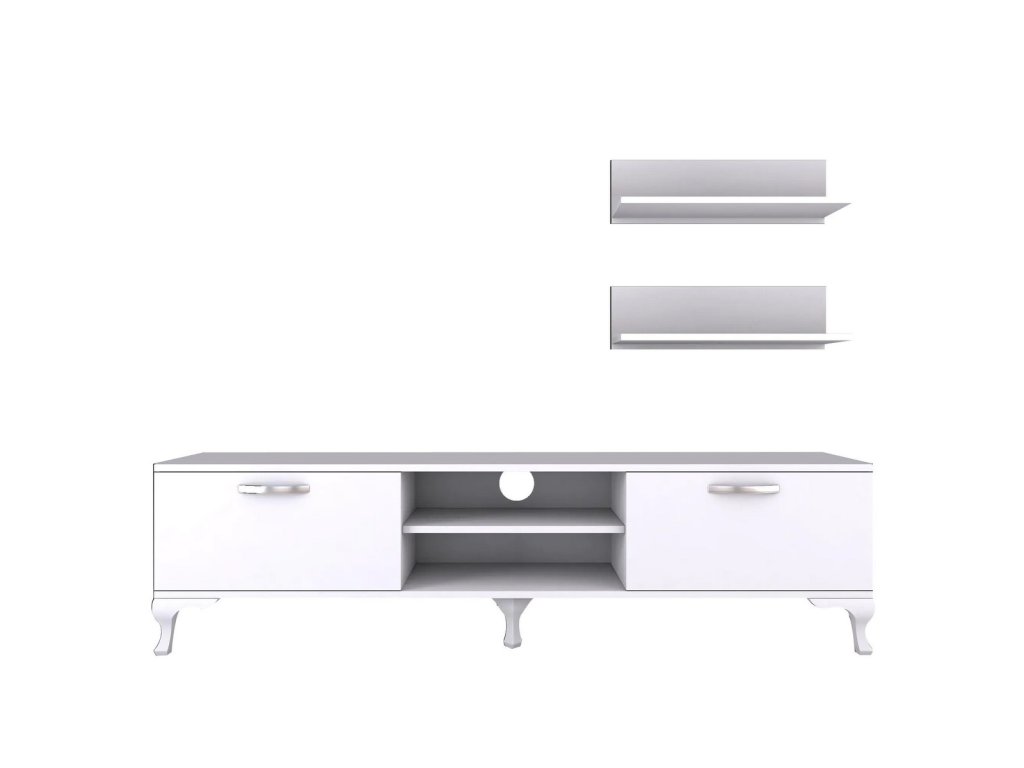Stylová obývací stěna navržená v čistém skandinávském stylu, která perfektně zapadne do Vašeho obývacího pokoje. Její minimalistický design v bílé barvě přináší moderní a vzdušný vzhled. Materiál: Melamin, VT laminát a další kvalitní materiály. Barva: bílá. Sestava obsahuje - TV stolek (150 x 30 x 43,7 cm), 2 závěsné police (50 x 13 x 15 cm). Tloušťka materiálu: 18 mm. Díky tomu je tato obývací stěna odolná a dlouhodobě udržitelná. Dodáváme v demontovaném stavu.Doplňkové parametry