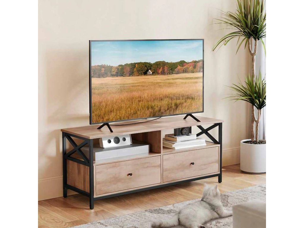 Stylový televizní stolek industriálního stylu. Vyroben z kvalitní LTD v barvě dub sonoma, konstrukce je kovová černé barvy. Obsahuje 2 praktické zásuvky a prostor pro přístroje. Díky konstrukci unese celkově až 91 kg, deska udrží 40 kg. Dodáváme v demontovaném stavu.Doplňkové parametry