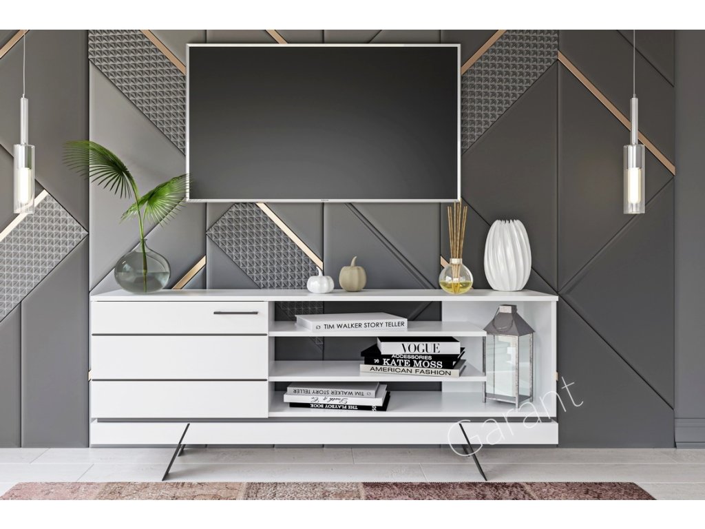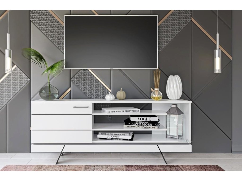 šířka: 165 cm | výška: 62 cm | hloubka: 38 cm Televizní stolek třídveřový. Stolek je vyroben z kvalitní LTD desky v barvě bílá mat, dvířka jsou vyrobeny z desky MDF v barvě bílá...