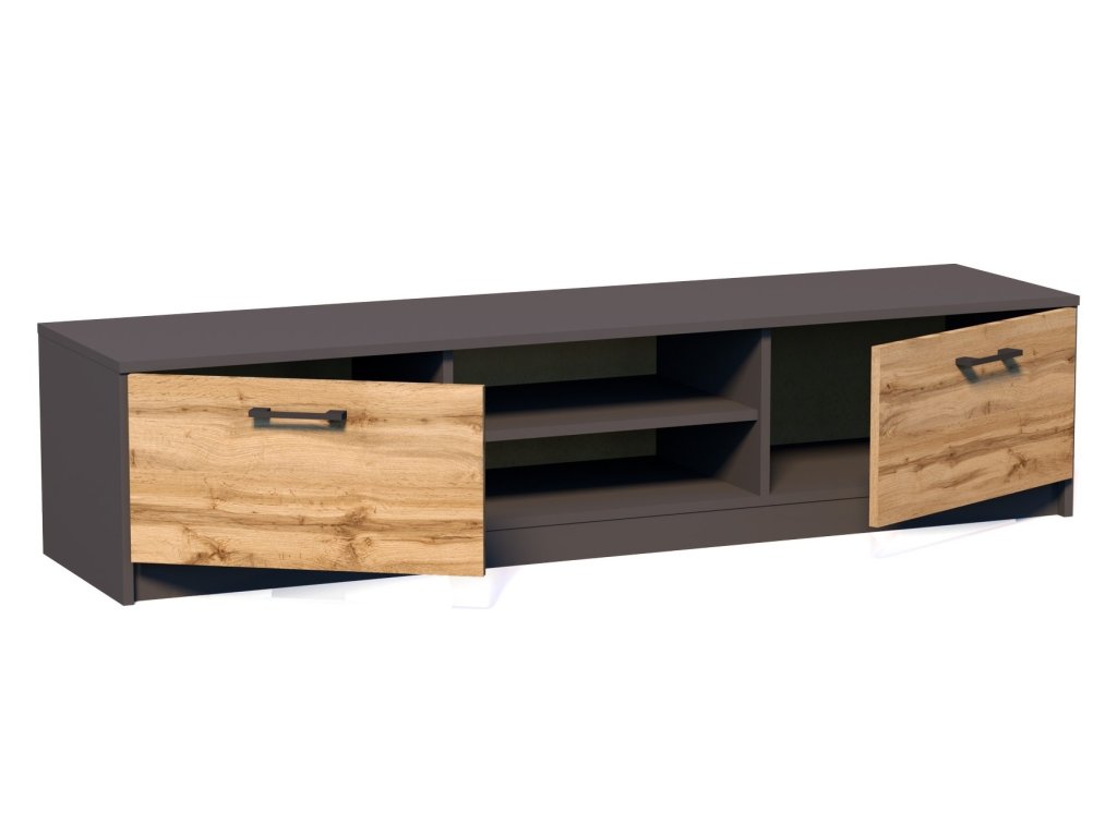 Dvoudveřový RTV stolek v moderním provedení. Korpus i dvířka jsou z kvalitní LTD. Barevné provedení - grafit/dub wotan. Lamino je odolné vůči vysokým teplotám, poškrábání a nárazům, hraněné ABS páskou. Jasně viditelná struktura dřeva. Dodáváme v demontovaném stavu.Doplňkové parametry