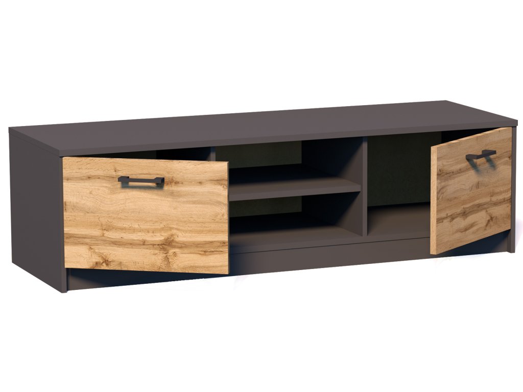 Dvoudveřový RTV stolek v moderním provedení. Korpus je v barevném provedení grafit a dvířka jsou v barvě dub wotan. Korpus i dvířka jsou vyrobena z kvalitního lamina. Lamino je odolné vůči vysokým teplotám, poškrábání a nárazům, hraněné ABS páskou. Jasně viditelná struktura dřeva. Dodáváme v demontovaném stavu.Doplňkové parametry