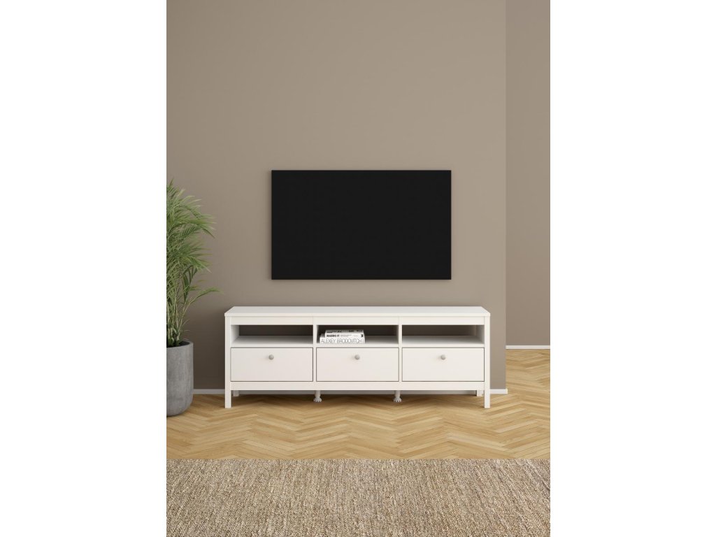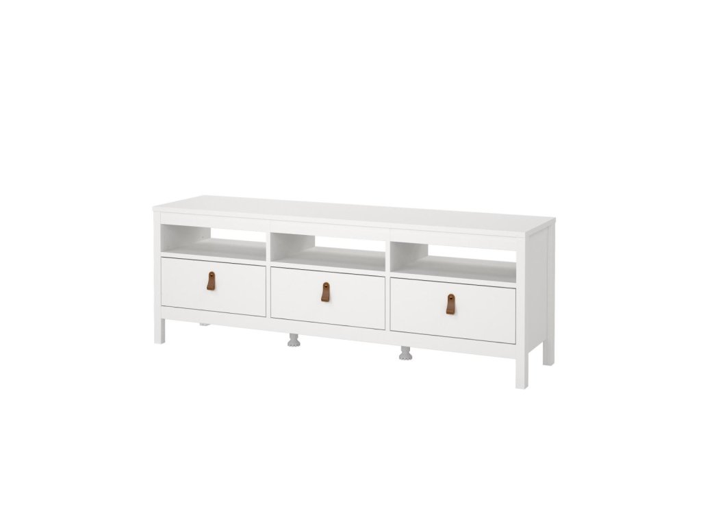 šířka: 144.6 cm | výška: 48.4 cm | hloubka: 35.6 cm TV Stolek SACHI: Retro elegance v antické bílé Introdukujte nádech vintage do svého obývacího pokoje s TV stolem SACHI....