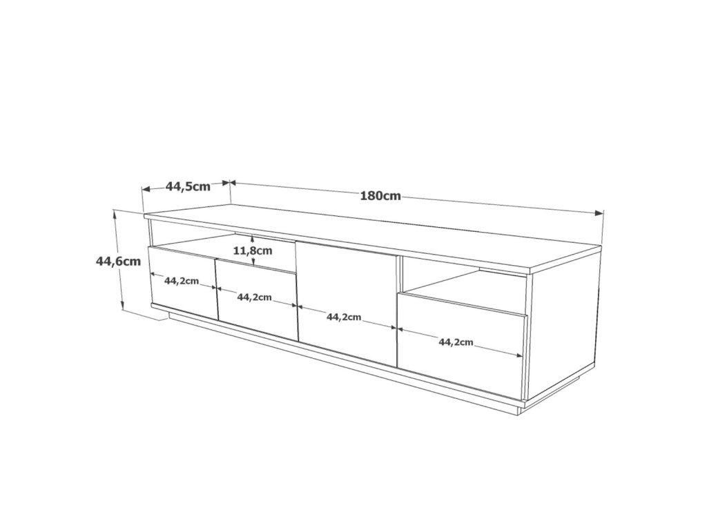 Vyrobeno z vysoce kvalitního materiálu LTD s tloušťkou 18 mm, což zaručuje vysokou odolnost a stabilitu produktu. S rozměry 180 x 44,8 x 44,6 cm snadno uspokojí vaše potřeby pro uložení televizoru a dalšího vybavení.