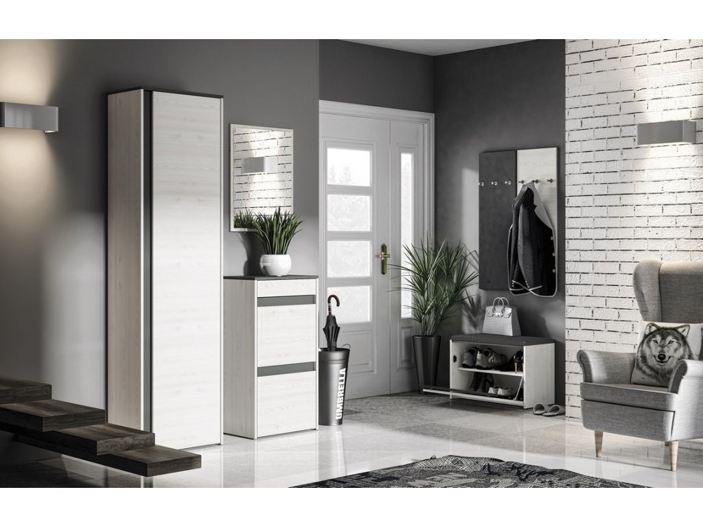 šířka: 34 cm | výška: 102 cm | hloubka: 2 cm Věšáková stěna je vyrobena z desky LTD v barvě borovice sněžná/antracit. Dodáváme v demontovaném stavu.