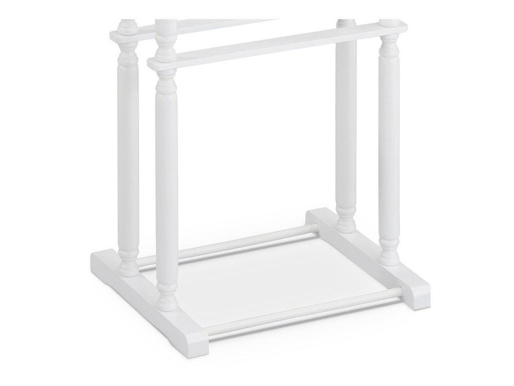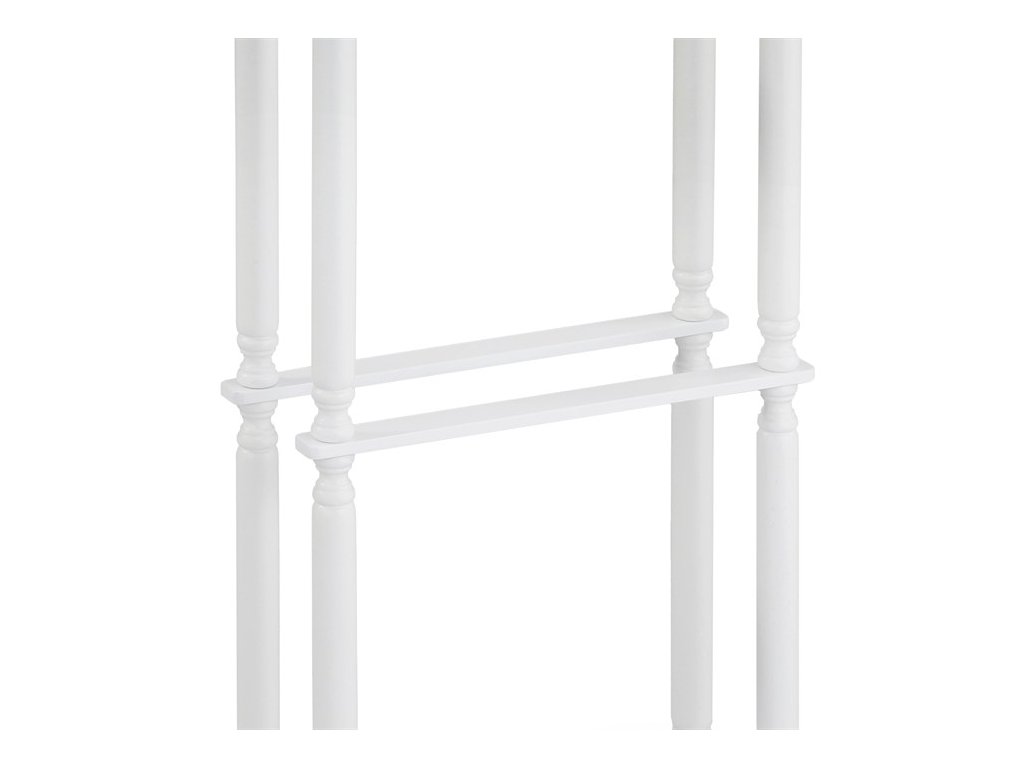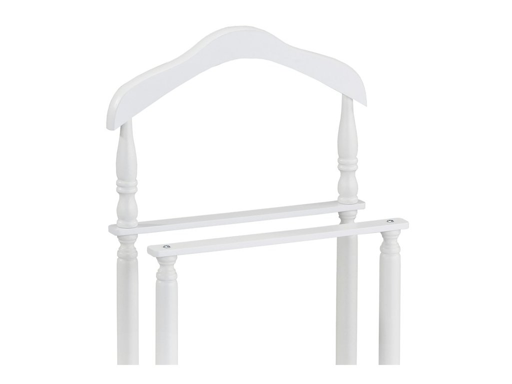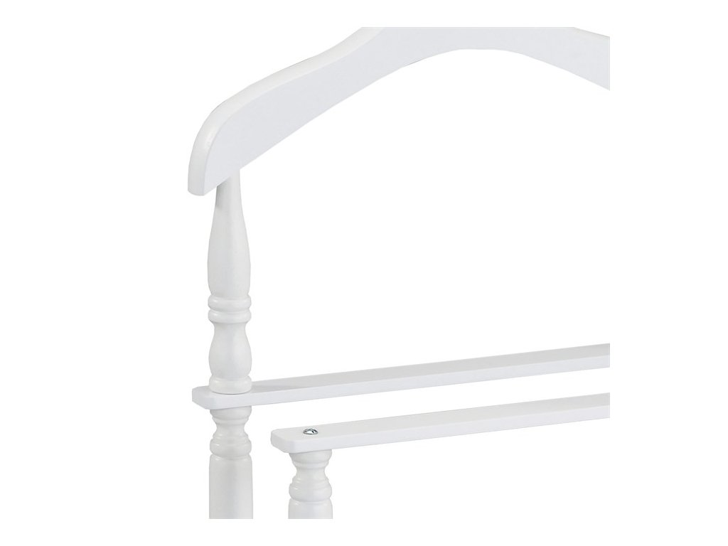 Němý sluha v bílém matném laku je vyroben z masivního kaučukovníku, který zajišťuje pevné a stabilní tělo. Jeho výška 108 cm nabízí dostatek prostoru pro zavěšení oblečení, zatímco spodní část je určena pro uložení kalhot nebo doplňků. Design kombinuje klasické tvary s praktickým využitím, což umožňuje efektivní organizaci oblečení v ložnici či šatně. Povrchová úprava matným lakem usnadňuje údržbu a přispívá k dlouhé životnosti. Nosnost je 7 kg, což odpovídá běžnému zatížení oděvy a doplňky.