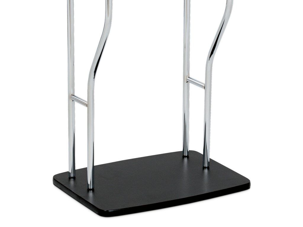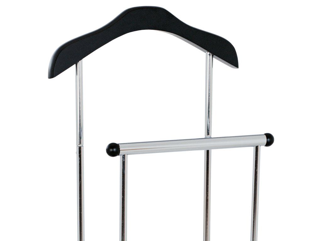 Němý sluha v černém matném provedení kombinuje pevnou MDF základnu s chromovanými kovovými prvky, které zajišťují stabilitu a dlouhou životnost. Výška 108 cm umožňuje pohodlné zavěšení oděvů na ramínko, zatímco spodní tyč slouží k zavěšení kalhot nebo šál. Design s čistými liniemi a kontrastem černé a chromu se hodí do moderních i klasických interiérů. Nosnost až 5 kg odpovídá běžnému domácímu použití. Praktický doplněk do ložnice či předsíně usnadňuje organizaci oblečení.
