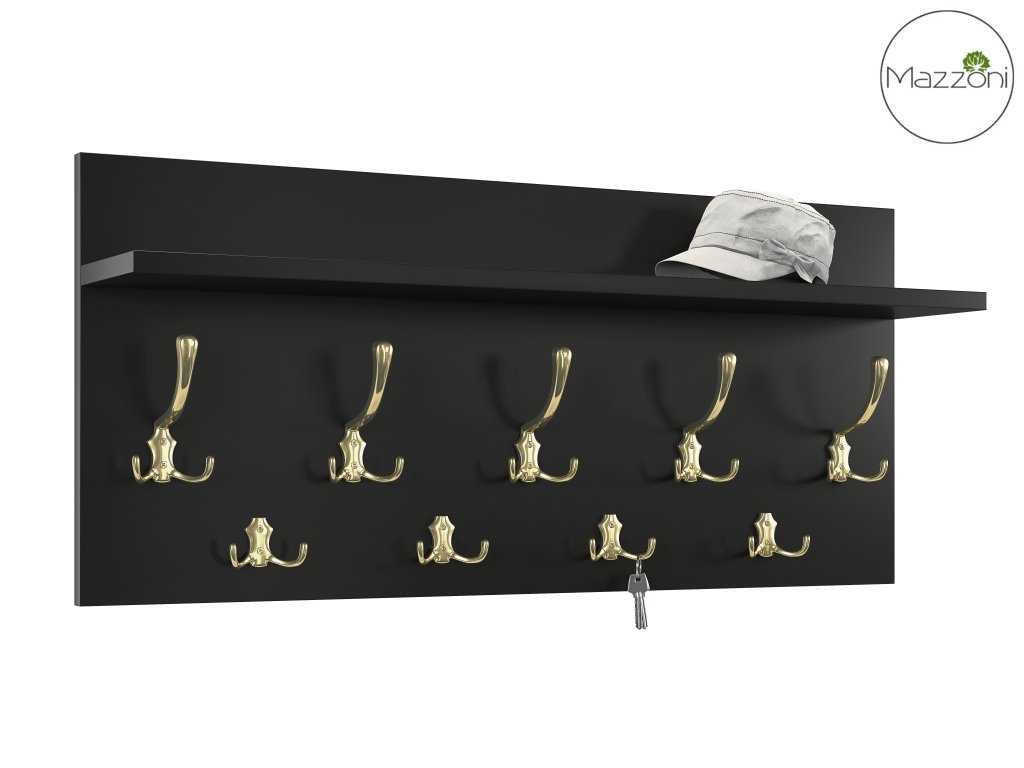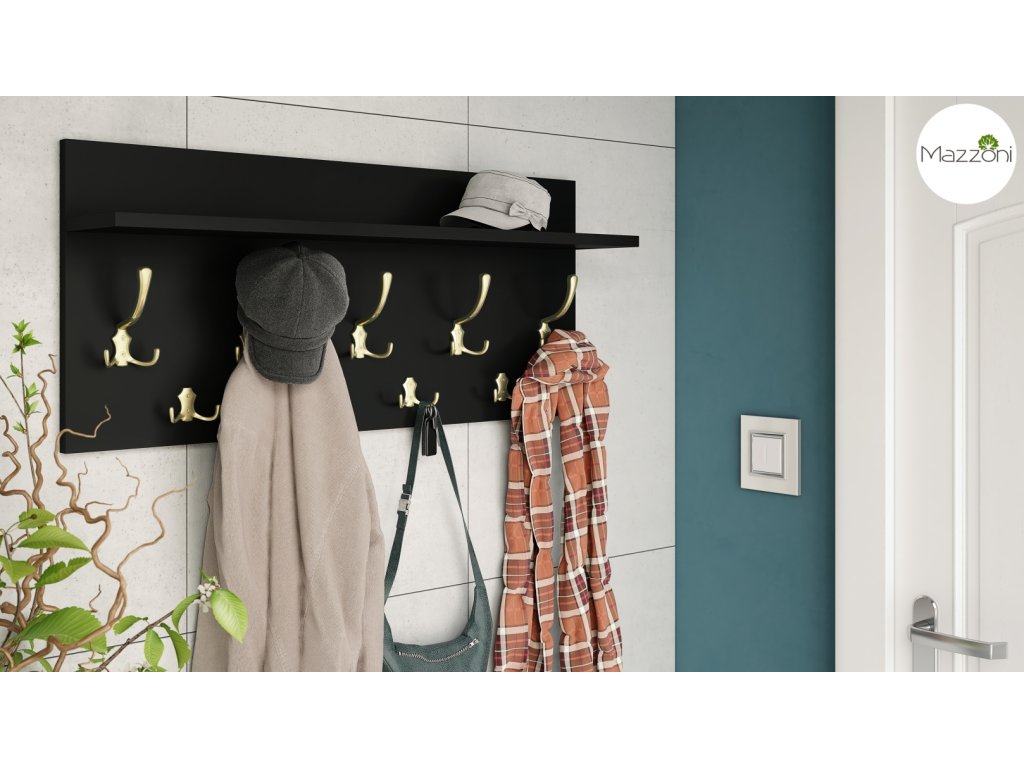 Elegantní věšák s praktickou policí zaujme dostatkem kovových věšáků (zlatá lesk) pro větší množství oblečení. Je vyroben s kvalitní LTD 18 mm. Barevné provedení je matná černá.