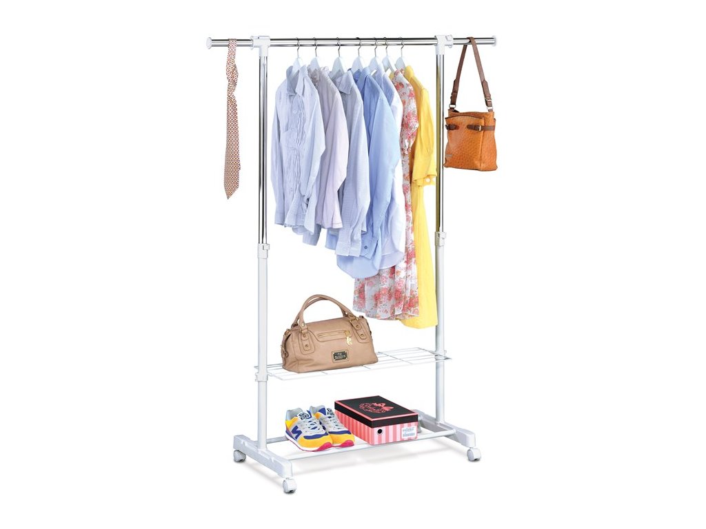 Stojan na šaty s odkladačem a poličkou v bílé barvě kombinuje pevný kovový rám s chromovanými prvky, které dodávají moderní vzhled a odolnost proti opotřebení. Výška stojanu je nastavitelná, což umožňuje přizpůsobit prostor pro zavěšení oděvů různých délek. Praktická spodní polička a odkladač poskytují dostatek místa pro uložení bot, krabic nebo tašek, čímž pomáhají udržet pořádek. Stabilní podstavec je vybaven kolečky pro snadnou manipulaci a přesun v interiéru. Díky kombinaci kovu a plastu je stojan navržen pro dlouhou životnost a snadnou údržbu.