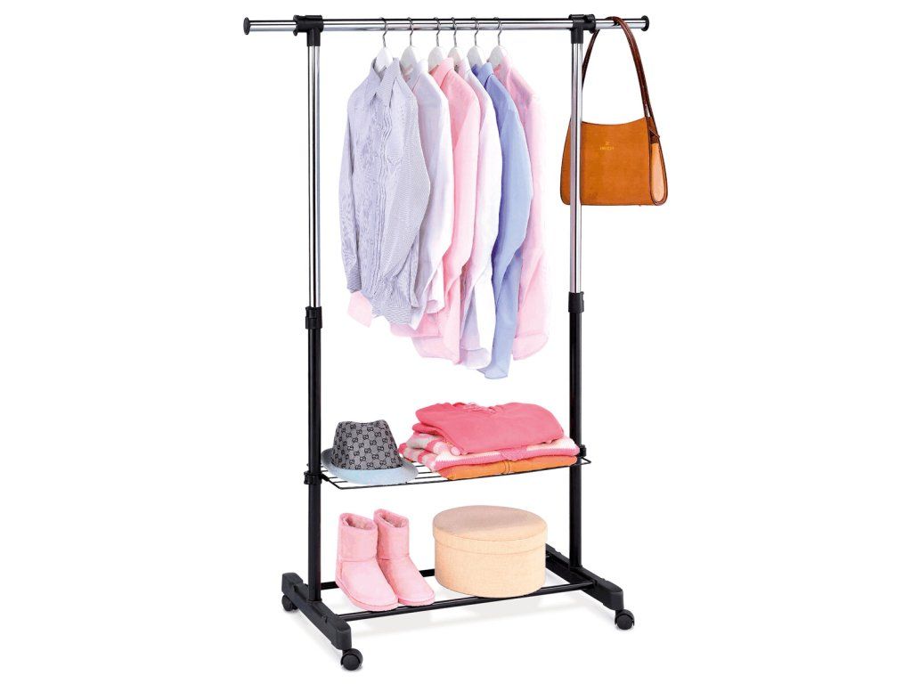 Stojan na šaty s odkladačem a poličkou v černém provedení kombinuje pevný kovový rám s chromovanými prvky pro moderní vzhled a dlouhou životnost. Výškově nastavitelná tyč umožňuje zavěšení oblečení různých délek, zatímco spodní drátěná polička nabízí prostor pro uskladnění bot nebo dalších doplňků. Praktický odkladač na boku je vhodný pro zavěšení tašek či šál. Stojan je vybaven čtyřmi kolečky pro snadnou manipulaci a stabilní základnou, která zajišťuje bezpečné postavení i při plném zatížení. Díky kombinaci kovu a plastu je snadno udržovatelný a vhodný do domácností i komerčních prostor.