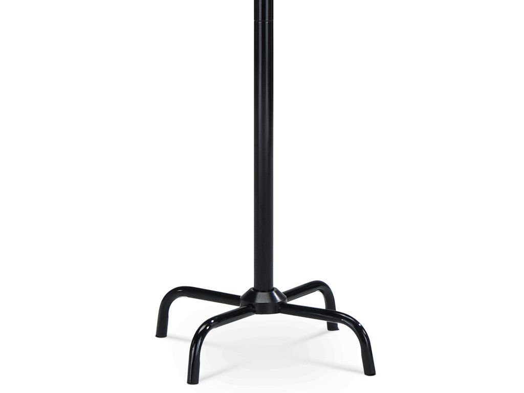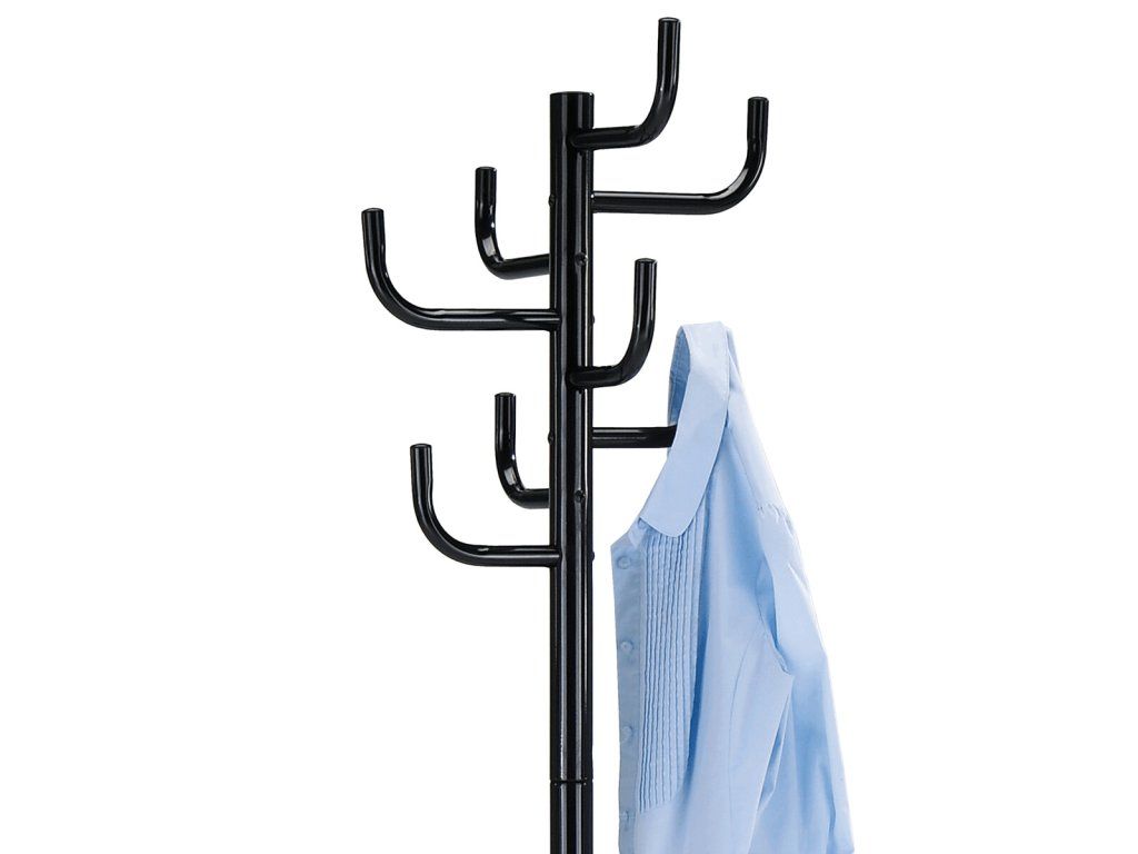 Stojanový věšák s výškou 182 cm je vyroben z pevného kovu s černým lesklým lakem, který zajišťuje odolnost a snadnou údržbu. Nabízí osm robustních háčků rozmístěných do tří úrovní, které umožňují efektivní uspořádání oděvů, klobouků či doplňků. Stabilní čtyřnohá základna přispívá k bezpečnému postavení i při plném zatížení, přičemž maximální nosnost věšáku je 10 kg. Jeho jednoduchý a funkční design se hodí do různých interiérů, od kanceláří po domácnosti, kde poskytuje praktické řešení pro ukládání svršků.