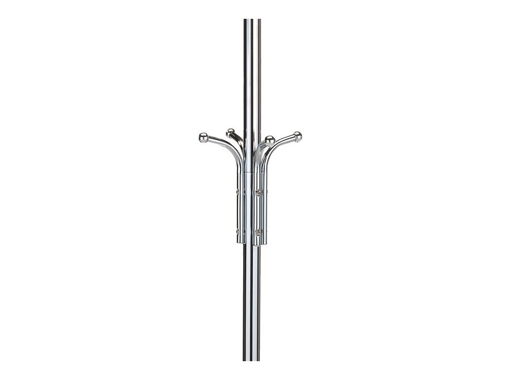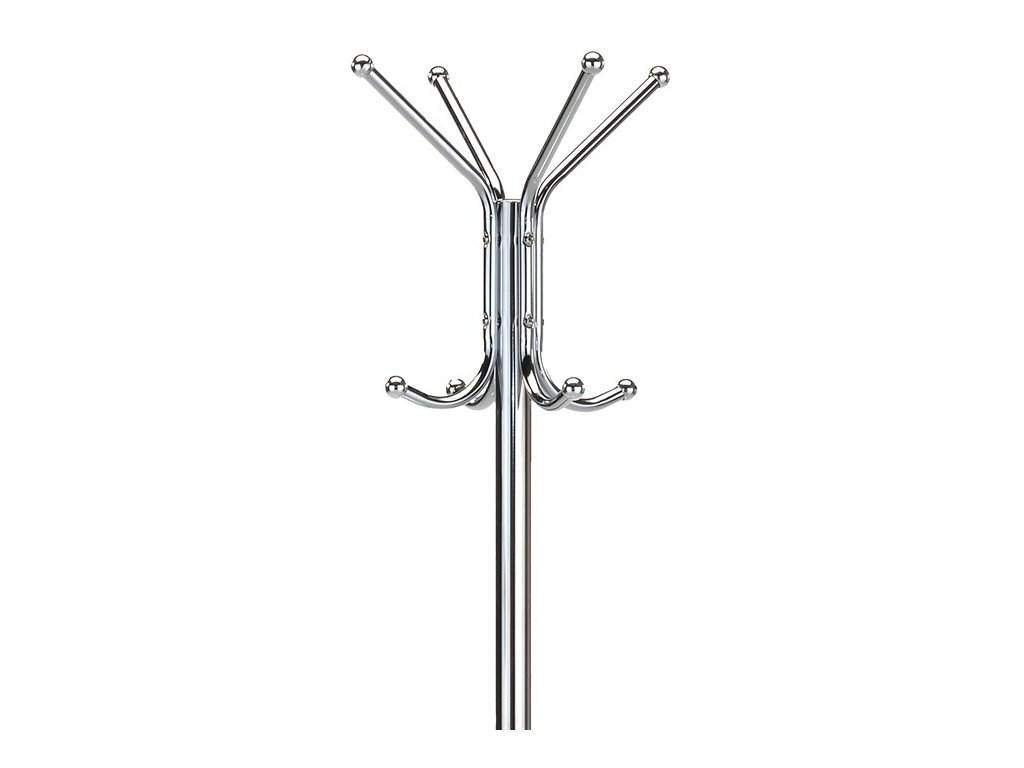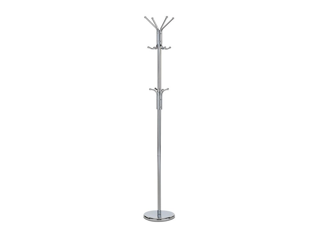 Stojanový věšák s výškou 182 cm je vyroben z pevného kovu s lesklou chromovou povrchovou úpravou, která zajišťuje odolnost a snadnou údržbu. Věšák nabízí celkem dvanáct háčků rozmístěných ve třech úrovních, což umožňuje efektivní uspořádání kabátů, klobouků i doplňků. Stabilní kruhová základna zajišťuje pevnost a bezpečnost při používání, přičemž maximální nosnost činí 10 kg. Díky minimalistickému designu v moderním stříbrném provedení se hodí do různých interiérů, od kanceláří po domácnosti.