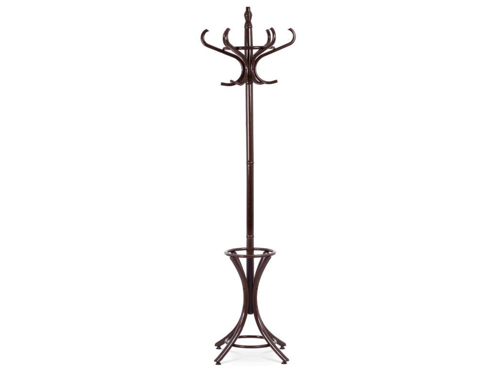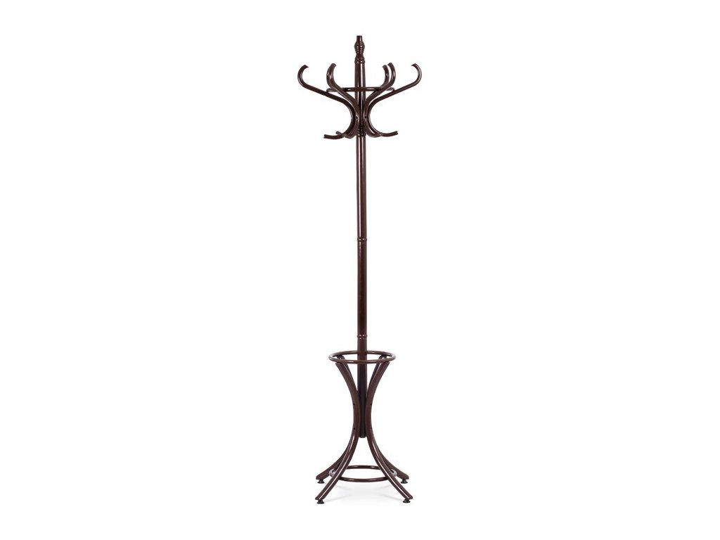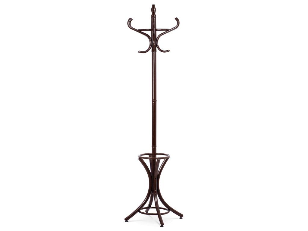Stojanový věšák z masivu v tmavě hnědém laku kombinuje pevnost topolu a břízy s tradičním designem. Jeho tělo tvoří stabilní noha s elegantně prohnutými háčky uspořádanými ve dvou úrovních, které nabízejí dostatek prostoru pro zavěšení kabátů, klobouků či šál. Pevná základna s rozšířenými nohami zajišťuje stabilitu i při plném zatížení. Výška 185 cm umožňuje pohodlné používání v předsíních, kancelářích či čekárnách. Povrchová úprava tmavým lakem podtrhuje přírodní kresbu dřeva a usnadňuje údržbu.