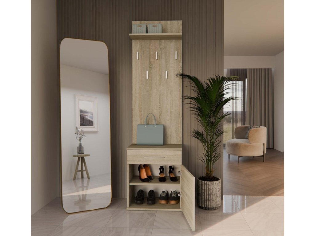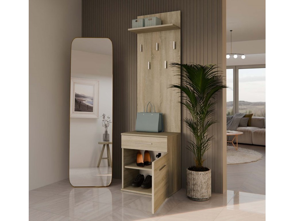 Věšák s botníkem DUO je ideálním řešením pro ty, kdo hledají kombinaci stylového vzhledu a chytrého úložného prostoru. Součástí nábytku je praktická nízká skříňka s výsuvnou zásuvkou a menší skříňkou pro odkládání drobností či obuvi. Horní panel je vybaven pěti háčky a odkládací policí, ideální pro klobouky, čepice nebo dekorace. Celek působí kompaktně, přehledně a zároveň poskytuje dostatek místa pro každodenní využití. Sestavu lze skvěle doplnit o šatní skříň s velkým zrcadlem ze stejné série – ideální volba pro harmonicky sladěný interiér předsíně. Dodáváme v demontu.Doplňkové parametry