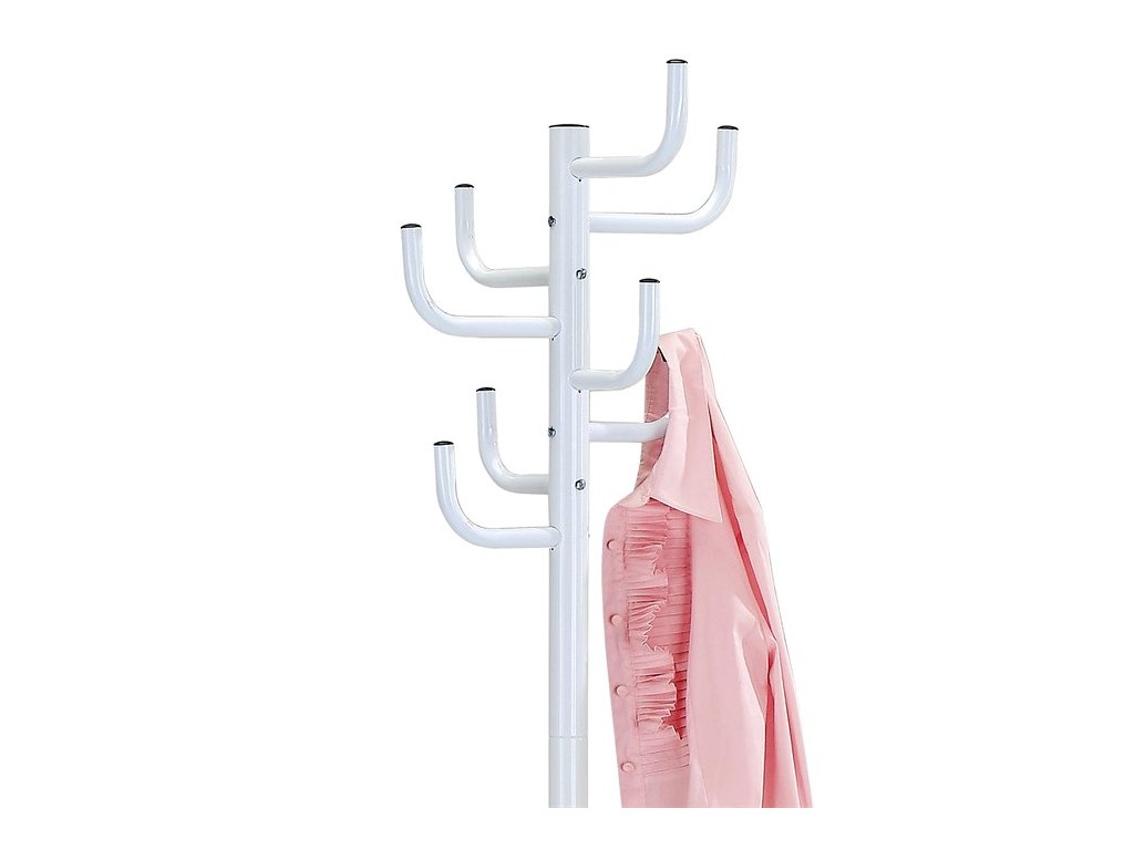 Stojanový věšák s kovovým tělem v bílém lesklém laku nabízí praktické řešení pro ukládání oděvů v předsíních, kancelářích či čekárnách. Disponuje celkem deseti háčky rozmístěnými ve třech úrovních, které umožňují efektivní využití prostoru pro zavěšení kabátů, šál či klobouků. Pevná kovová základna se čtyřmi nohami zajišťuje stabilitu a bezpečnost při používání. Výška 182 cm umožňuje pohodlné zavěšení i delších oděvů. Věšák je navržen s ohledem na dlouhou životnost a snadnou údržbu díky povrchové úpravě práškovým lakem.