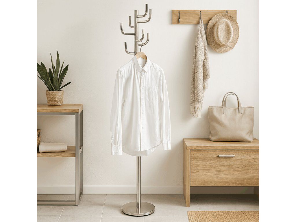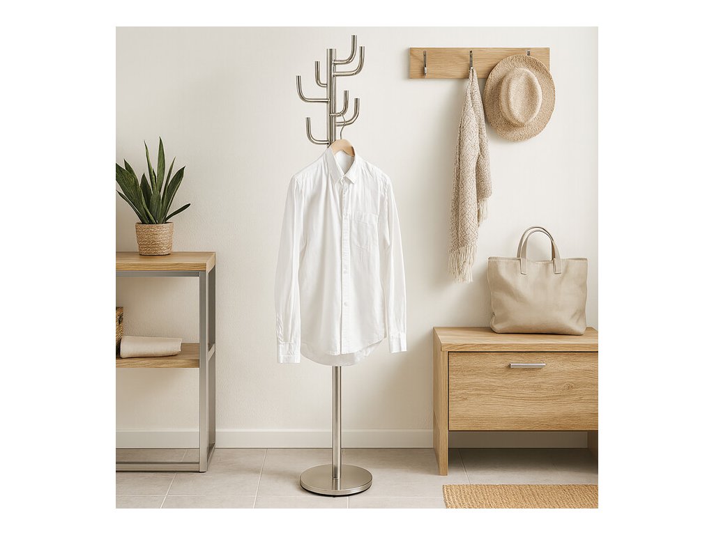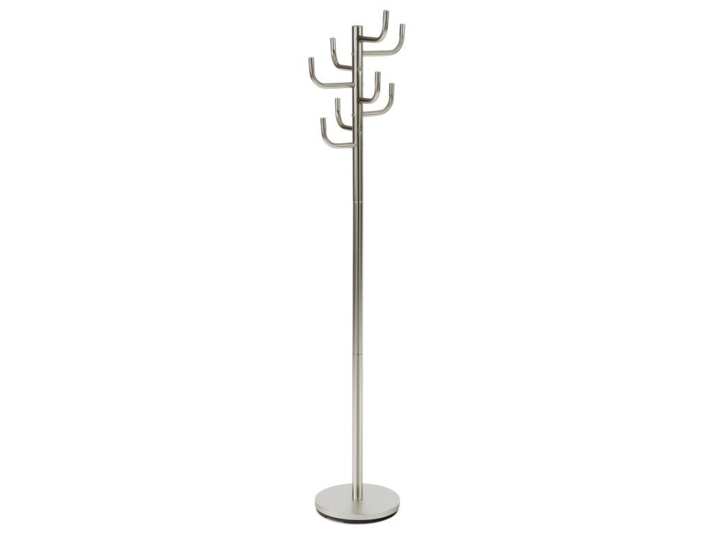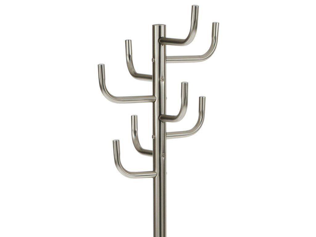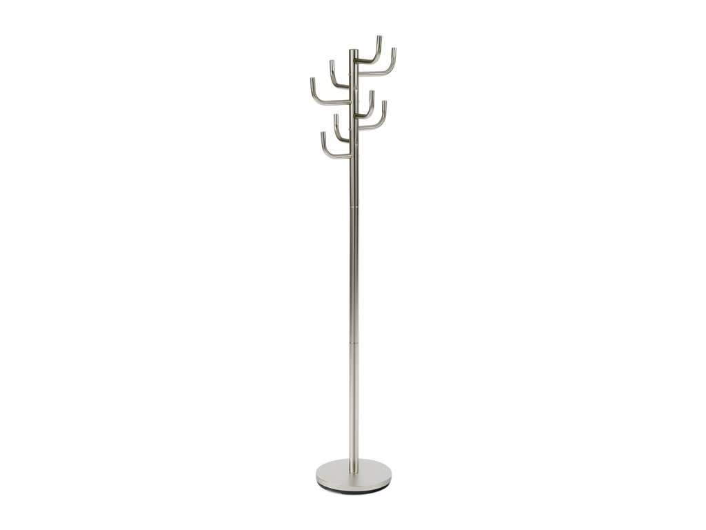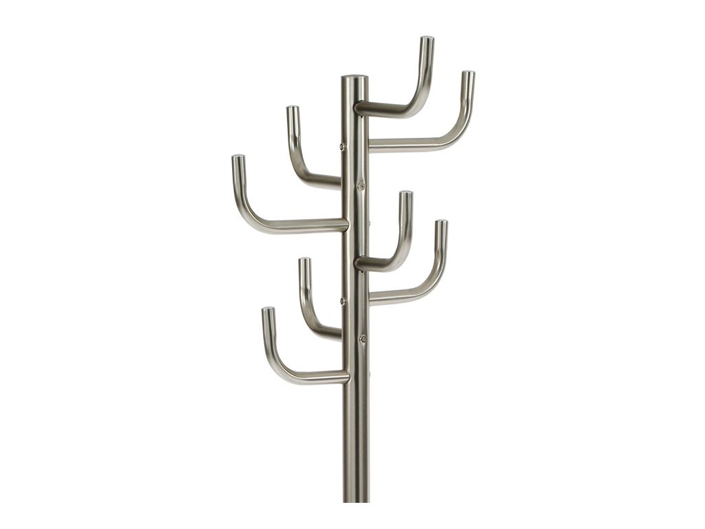 Stojanový věšák s kovovým provedením v broušeném niklu nabízí praktické řešení pro uspořádání oděvů a doplňků v interiéru. Je vybaven osmi pevnými háčky rozmístěnými do tří úrovní, které umožňují efektivní využití prostoru a snadný přístup k zavěšeným věcem. Stabilní kruhová základna zajišťuje bezpečnou oporu a celkovou stabilitu věšáku, jehož výška činí 175 cm. Povrchová úprava broušeným niklem přispívá k odolnosti proti poškození a usnadňuje údržbu. Nosnost věšáku je 10 kg, což odpovídá běžným požadavkům na zavěšení kabátů, šál či tašek.