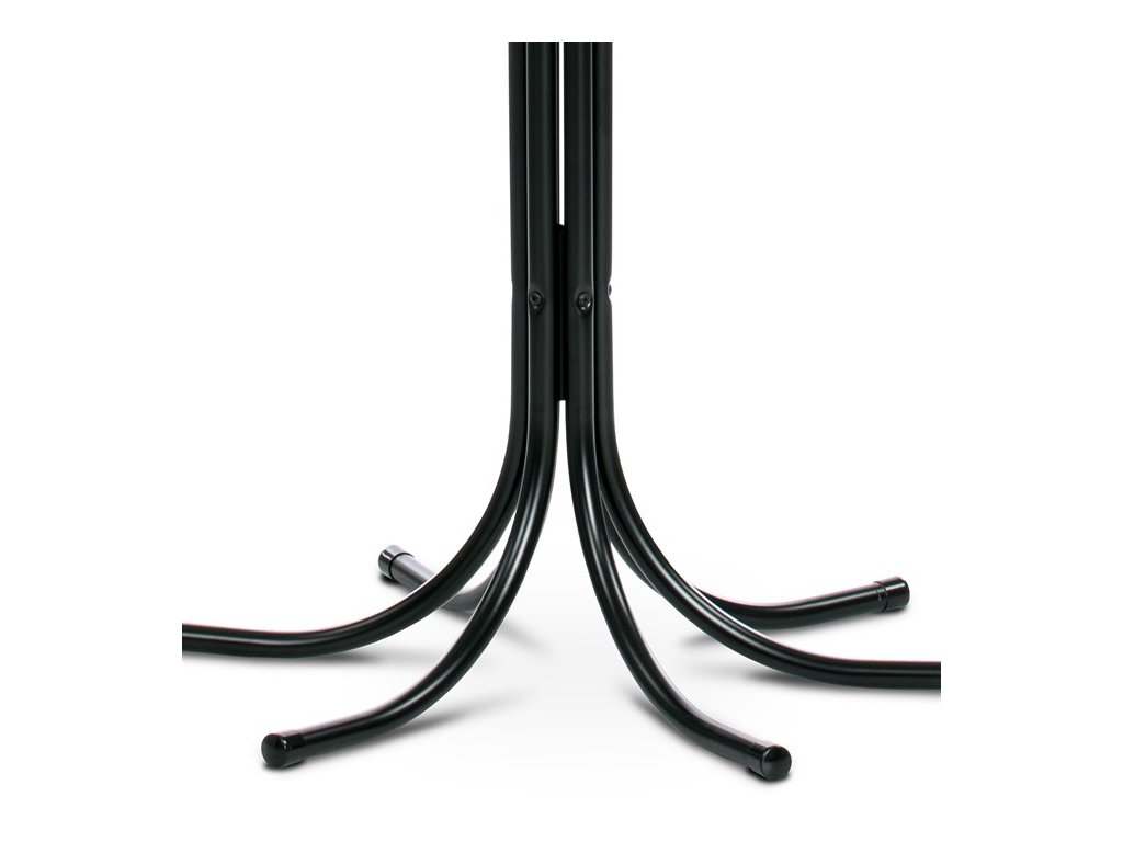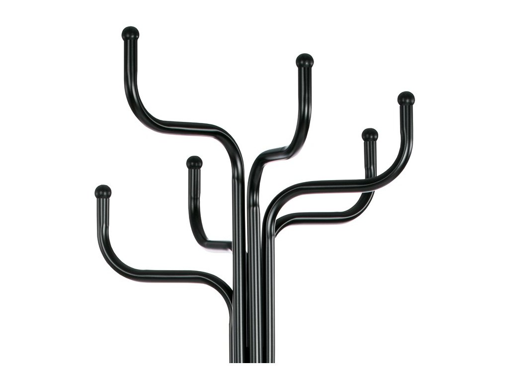 Stojanový věšák v černém matném provedení nabízí šest pevných kovových ramen zakončených kulatými koncovkami, které zajišťují bezpečné zavěšení oděvů a doplňků. Výška 188 cm umožňuje pohodlné využití v předsíních, kancelářích či čekárnách. Stabilní kovová základna s rozloženými nohami zajišťuje pevnost a rovnováhu i při plném zatížení do 12 kg. Povrchová úprava matným lakem chrání materiál proti poškození a usnadňuje údržbu. Věšák kombinuje jednoduchý design s funkčností, vhodný pro různé typy interiérů.