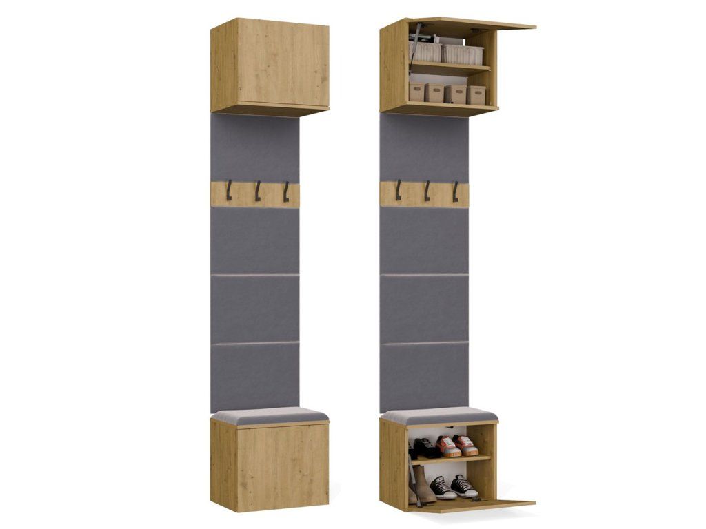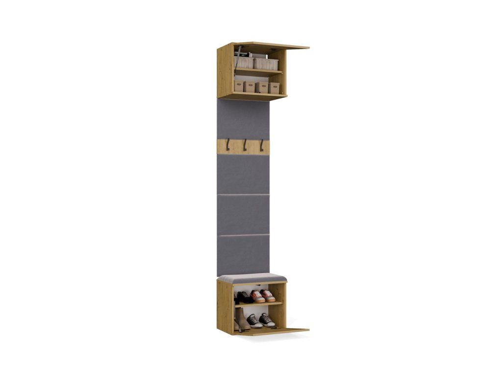 Věšákový panel do předsíně AGA 1V dub artisan je praktický modul do předsíně pro každého, kdo chce spojit místo na odložení bund, pohodlné obouvání i úložný prostor v jednom kompaktním řešení.