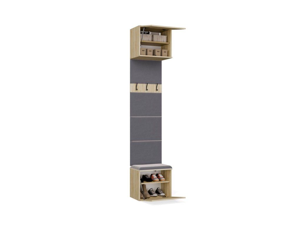 Věšákový panel do předsíně AGA 1V dub sonoma je praktický modul do předsíně pro každého, kdo chce spojit místo na odložení bund, pohodlné obouvání i úložný prostor v jednom kompaktním řešení.