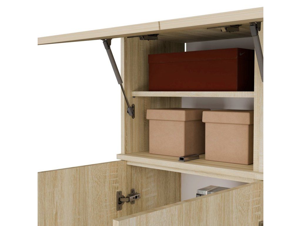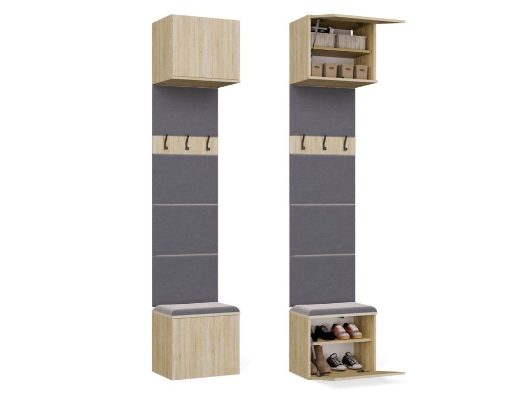 Horní skříňka nabídne místo na čepice, šály nebo doplňky, prostřední část se třemi háčky poslouží na kabáty a tašky a spodní skříňka pod čalouněným sedákem pomůže s ukládáním obuvi nebo běžných denních věcí. Díky bezúchytovému systému TIP-ON působí panel čistě a moderně, takže snadno zapadne i do menší předsíně. V dekoru dub sonoma působí sestava přirozeně, prosvětlí prostor a snadno se kombinuje s dalším nábytkem v předsíni.
