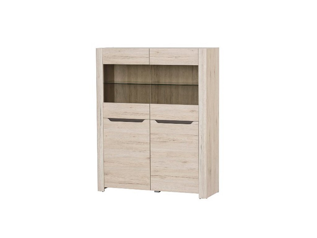 Policová vitrína dvoudveřová ze sektorové řady DESJO. Tento moderní nábytek je součástí sestavy určené do jídelny nebo obývacího pokoje. Celá řada se vyznačuje úspěšnou kombinací současné a moderní přírodní formy. Jednoduchý styl umocňuje senzační bezúchytový systém nábytku. Vyrábí se z vysoce kvalitní dýhované dřevotřískové desky s fólií, sklo je tvrzené s hnědým zabarvením. Dekor s 3D efektem vizuálně dává dojem hlubokého povrchu. Široký výběr vám zaručí si sestavit nábytek podle svých představ. Barevné provedení je dub sanremo s dekorativním proužkem hnědé barvy. Nábytek se dodává v demontovaném stavu. Výrobce doporučuje vysoký nábytek připevnit ke stěně. v naší nabídce nabízíme doporučené LED osvětlení.