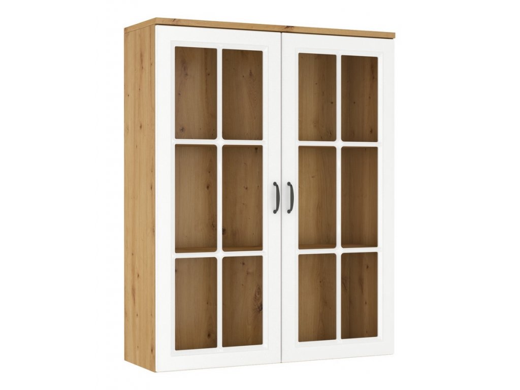 Nádstavec dvoudveřový ke komodě v moderním provedení venkovského stylu. Korpus je vyroben z kvalitního lamina v barvě dub artisan, prosklená dvířka jsou vyrobena z desky MDF v barvě bílé. Úchyty jsou kovové černé. Doporučujeme kombinaci tohoto nádstavce s komodou šíře 100 cm. Dodáváme v demontovaném stavu.