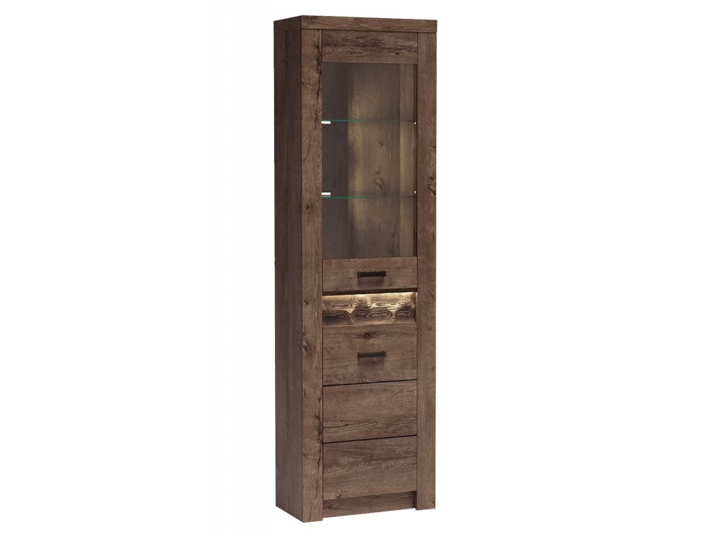 Rohová vitrína kombinovaná. Uprostřed je 1 zásuvka, v horní polovině je prosklená vitrína se dvěma policemi, dole je skříňka s jednou policí. Systém je exkluzivní kolekce navržena v moderním duchu. Vsazením LED osvětlení do ozdobné rýhované lišty, které najdete v naší další nabídce k dokoupení, je zvýrazněn rustikální vzhled masivního dřeva. Možnost dokoupení LED bodového osvětlení i u skleněných polic. Celá řada se vyznačuje elegancí a jednoduchými tvary, které zaručují plné využití prostoru. Nábytek je vyroben z kvalitního lamina s ABS hrany ( 0,5-0,8 mm ). Barevné provedení jasan tmavý. Vitrína má univerzální otvírání dvířek. Dodáváme v demontovaném stavu.