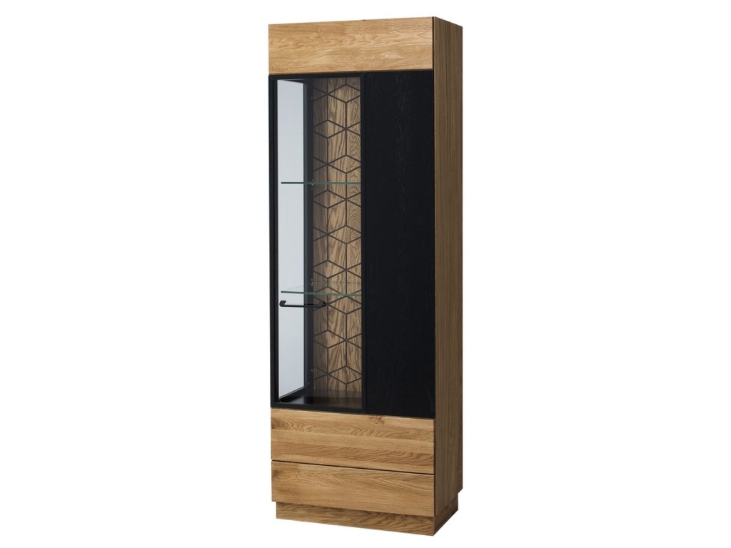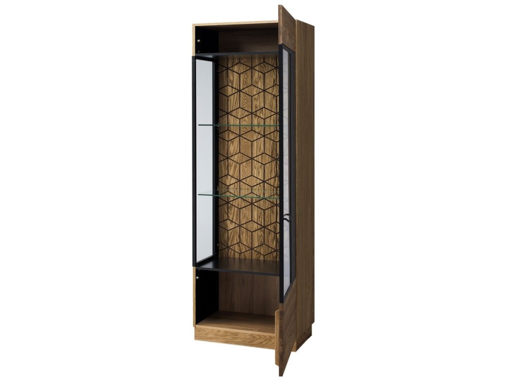 Vitrína jednodveřová pravá prosklená ze sektorové řady MOSAIC. Moderní provedení v kombinaci masivního leštěného dubu s frézovanými ornamenty šestiúhelníků a kovovými prvky dodá jedinečný vzhled vaší jídelně nebo obývacímu pokoji. Povrch vnějších částí je ošetřen olejem - dub medový nebo lakovaný - černý mat. Korpus je doplněn z vnější strany přírodní dýhou, vnitřní strana je vyrobena z desky LTD v barvě přírodního dřeva. Dvířka jsou vyrobeny z leštěného masivního dubu. Sklo je tvrzené. Úchyty jsou kovové černé. Možno dokoupit LED osvětlení. Dodáváme již ve smontovaném stavu.