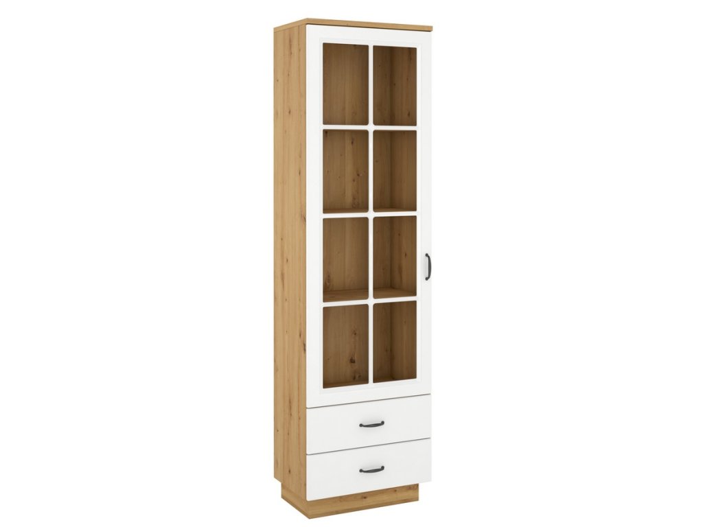 Vitrína vysoká jednodveřová se dvěma zásuvkami v moderním provedení venkovského stylu. Korpus je vyroben z kvalitního lamina v barvě dub artisan, dvířka a čela zásuvek jsou vyrobena z desky MDF v barvě bílé. Dvířka jsou prosklená, úchyty jsou kovové černé. Dodáváme v demontovaném stavu.