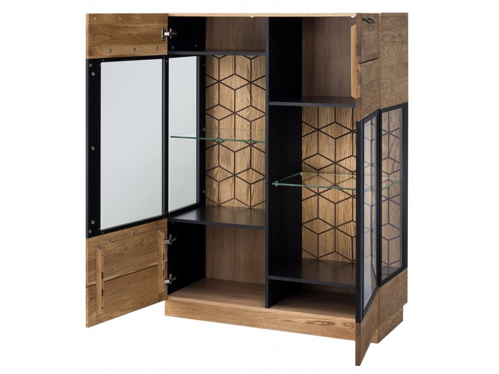 Vitrína dvoudveřová nízká prosklená ze sektorové řady MOSAIC. Moderní provedení v kombinaci masivního leštěného dubu s frézovanými ornamenty šestiúhelníků a kovovými prvky dodá jedinečný vzhled vaší jídelně nebo obývacímu pokoji. Povrch vnějších částí je ošetřen olejem - dub medový nebo lakovaný - černý mat. Korpus je doplněn z vnější strany přírodní dýhou, vnitřní strana je vyrobena z desky LTD v barvě přírodního dřeva. Dvířka jsou vyrobeny z leštěného masivního dubu. Sklo je tvrzené. Úchyty jsou kovové černé. Možno dokoupit LED osvětlení. Dodáváme již ve smontovaném stavu.