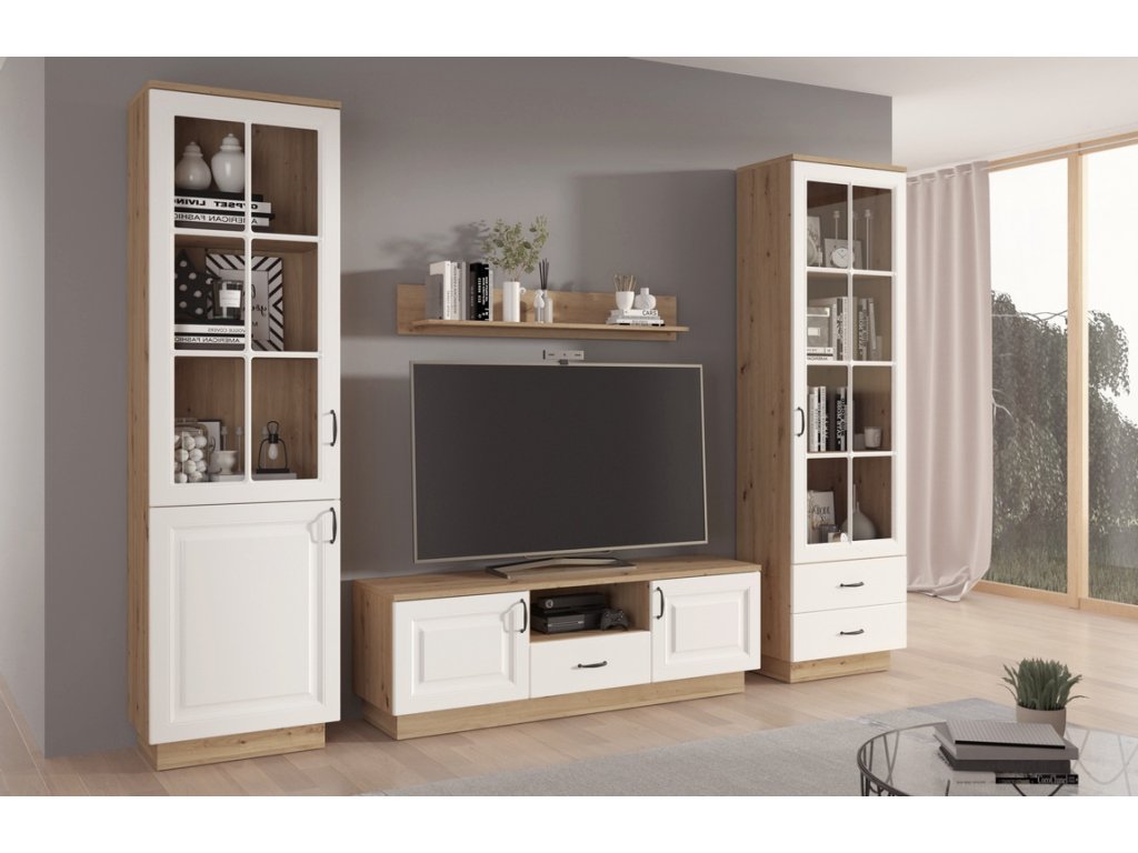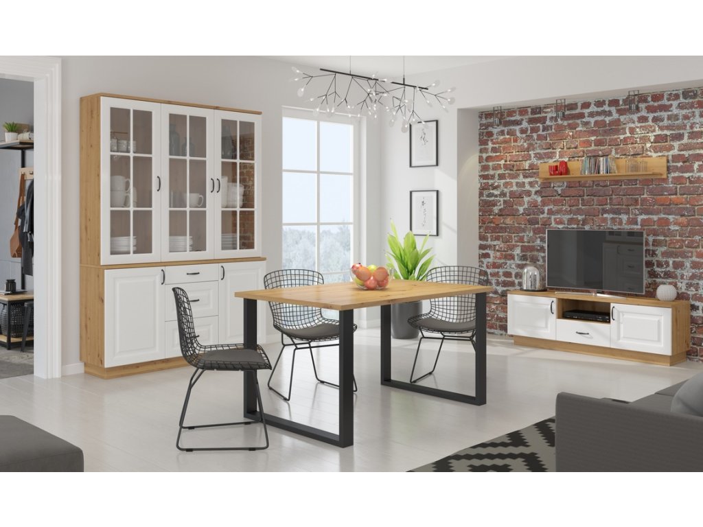 Vitrína vysoká dvoudveřová v moderním provedení venkovského stylu. Korpus je vyroben z kvalitního lamina v barvě dub artisan, dvířka jsou vyrobena z desky MDF v barvě bílé. Dvířka jsou prosklená, úchyty jsou kovové černé. Dodáváme v demontovaném stavu.