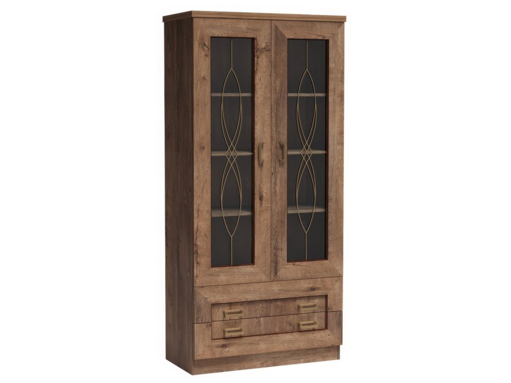 Vitrína dvoudveřová se 2 zásuvkami ze sektorové řady. Vitrína má 2 prosklené dvířka a 2 praktické zásuvky. Systém je exkluzivní kolekce navržena v duchu vintage. Celá řada se vyznačuje elegancí a jednoduchými tvary, které zaručují plné využití prostoru. Nábytek je vyroben z velmi kvalitní LTD o tloušťce 16 mm, horní deska zesílena na 32 mm, lišty na čele nábytku jsou MDF, hrany ABS. Tvrzené sklo ve vitrínách je jemně zdobené. Elegantní úchyty jsou z kovu. Barevné provedení dub lefkas. Dodáváme v demontovaném stavu.